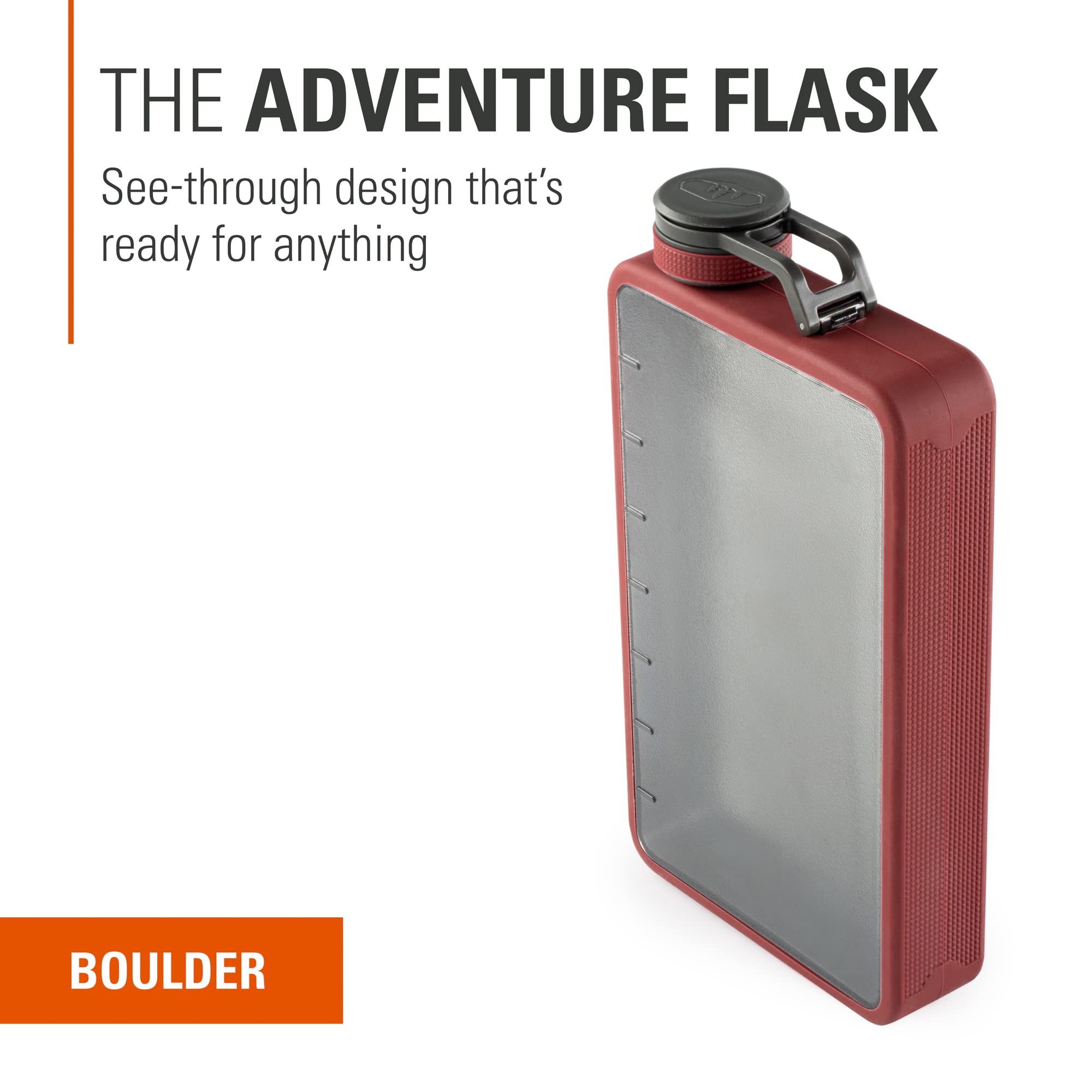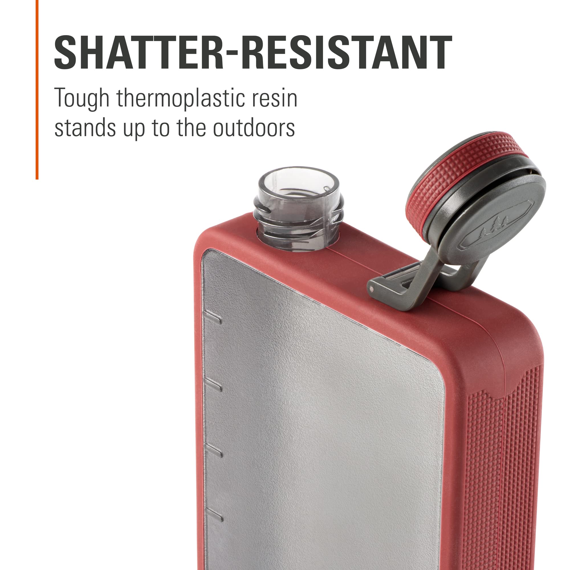Tough and shatter-resistant, the Boulder Flask can stand up to nearly any outdoor adventure; Thermoplastic resin body keeps your drink of choice intact.