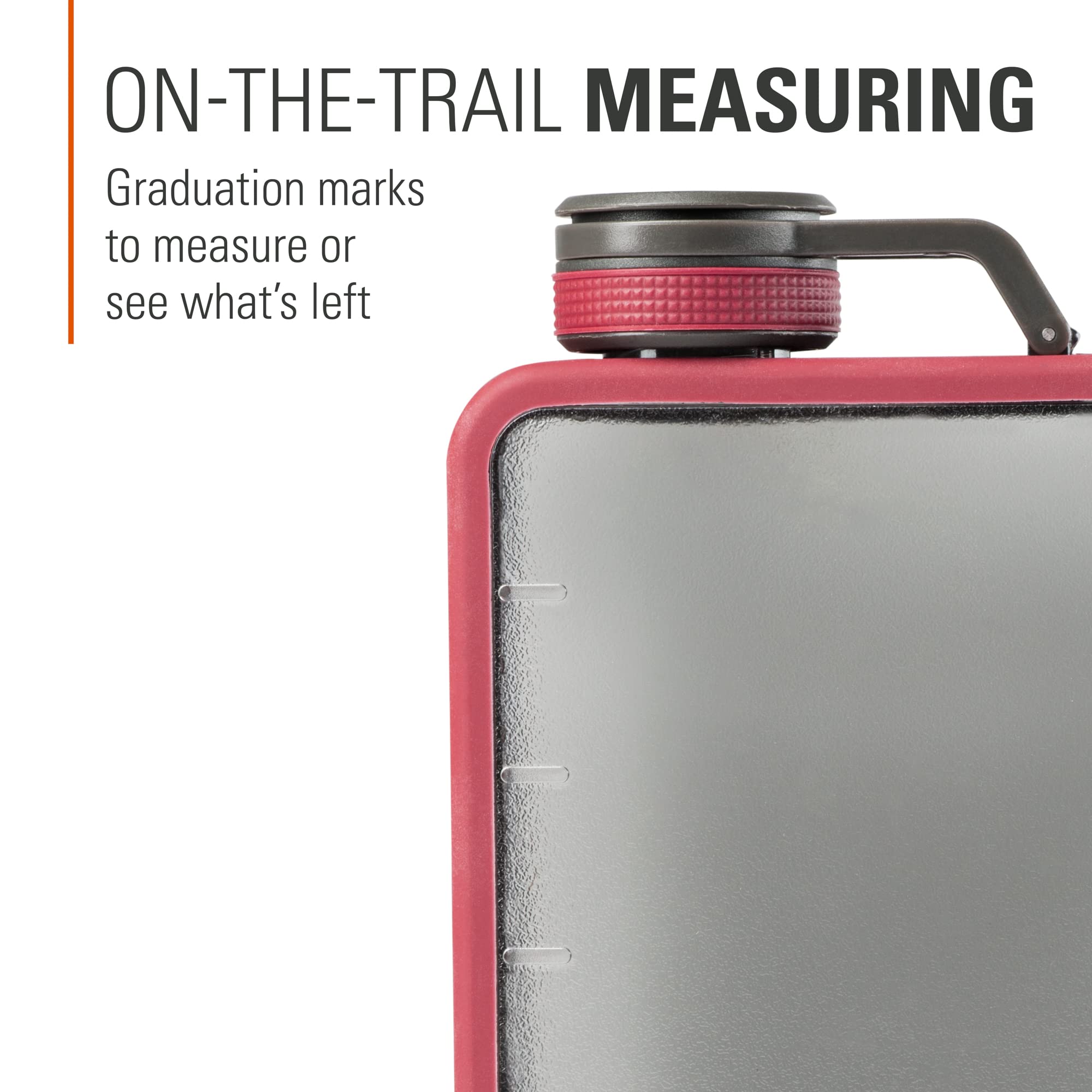 Wide mouth opening makes for easy filling, pouring and drinking; Molded graduation marks help you quickly measure or see what’s left while you’re on the trail.