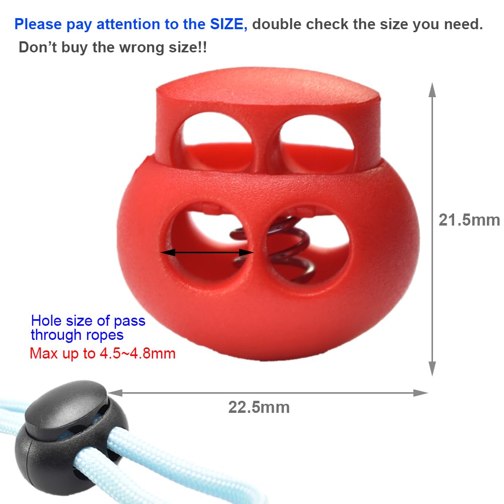 Product Included : 10 Pack Red Plastic Bungee Cord Locks (the cord excluding) ,Outter Size : 22.5 x 21.5mm ,Hole Dia. Just can Pass through Max up to 4.5~4.8mm Drawstring Ropes