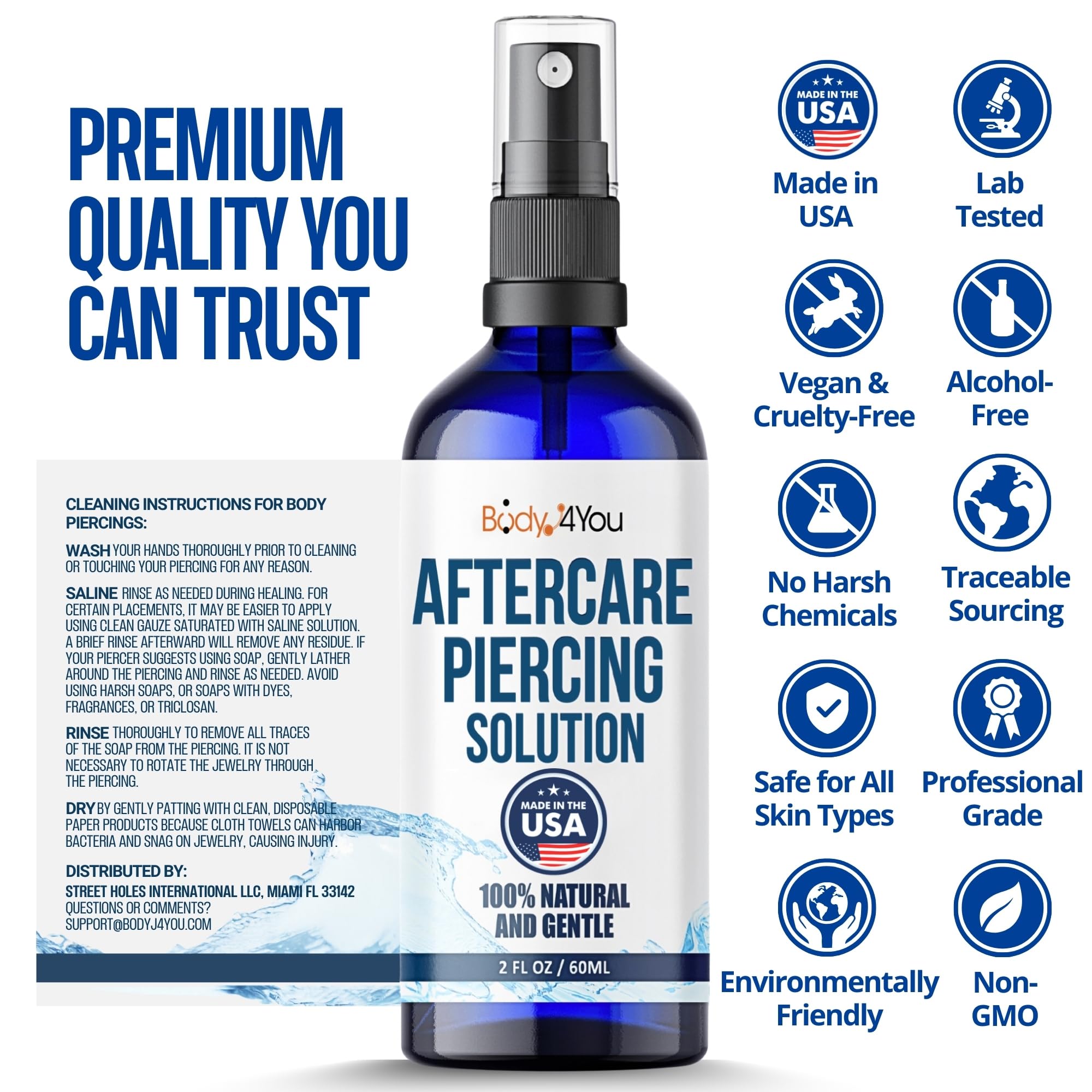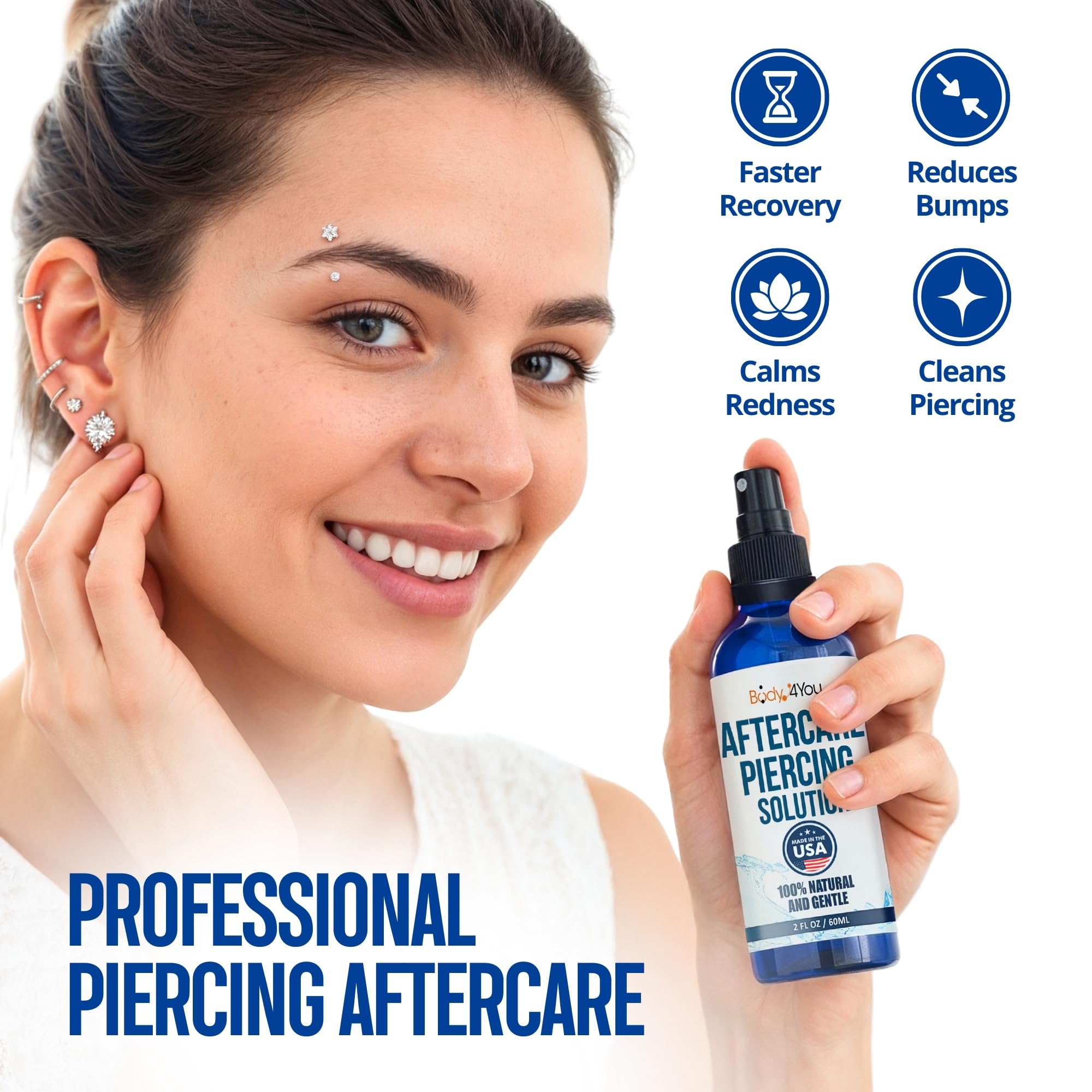 EXPERT PIERCING SPRAY AFTER CARE: Created by Piercing Professionals for Healthy Piercing Experience. Our Aftercare Products Aim to Minimize Skin Bumps, Keloids, and Elevated Scars While Calming Redness, Tenderness, and Swelling. CONVENIET BOTTLE: 2 Fl Oz (60ml) with Fine Mist Sprayer and Protective Cap to Keep Nozzle Clean and Leak-Proof