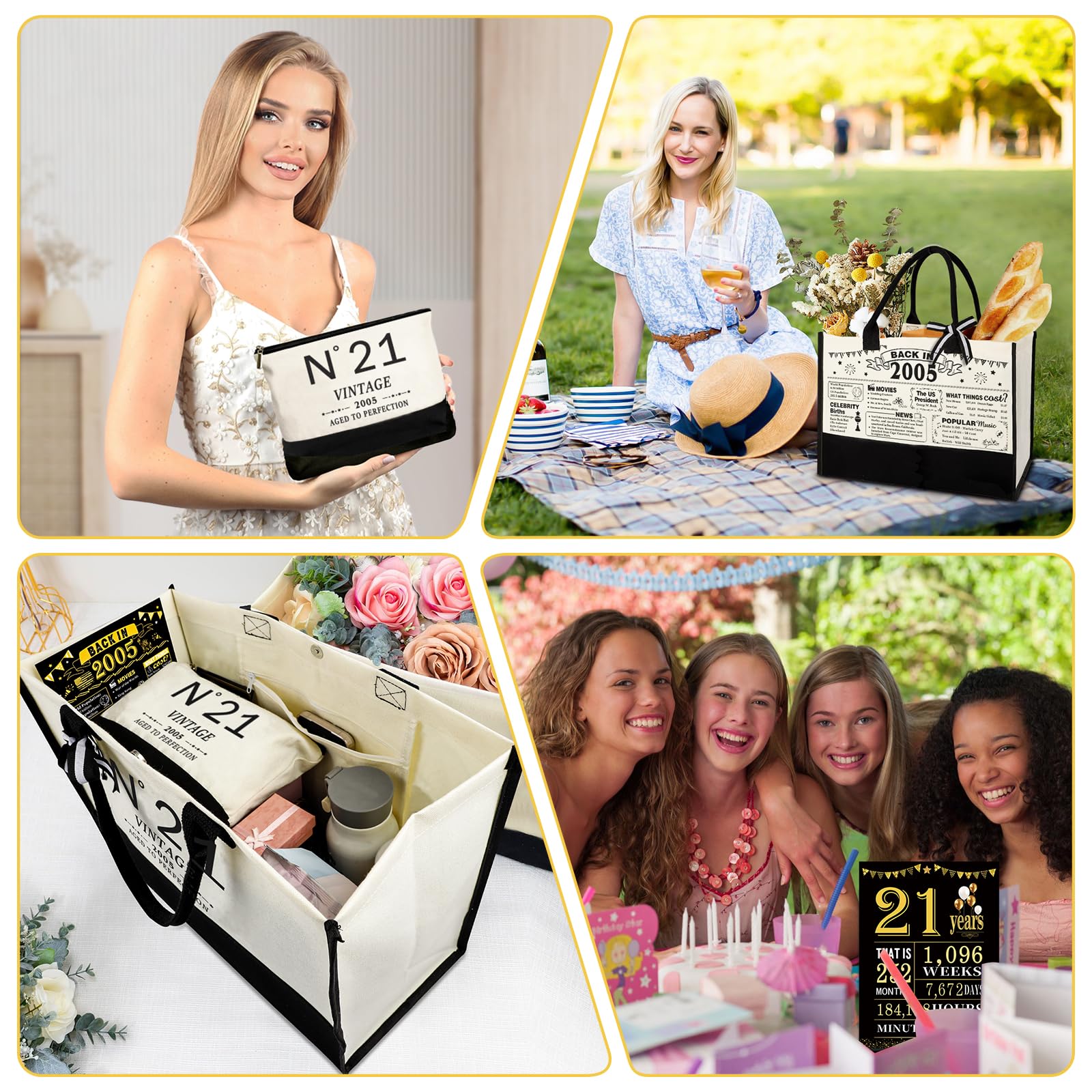 Great Gift for Her 21st Birthday: This gifts set for 21st birthday women contains: 1 X 2005 beach bag, 1 X makeup bag, 1 X back in 2005 poster, 1 X greeting card. Unique canvas tote bag gifts set will be a adorable gift for women's 21st birthday. This birthday 21 gifts themed idea makes the perfect choice for putting a smile on her face on their special day.