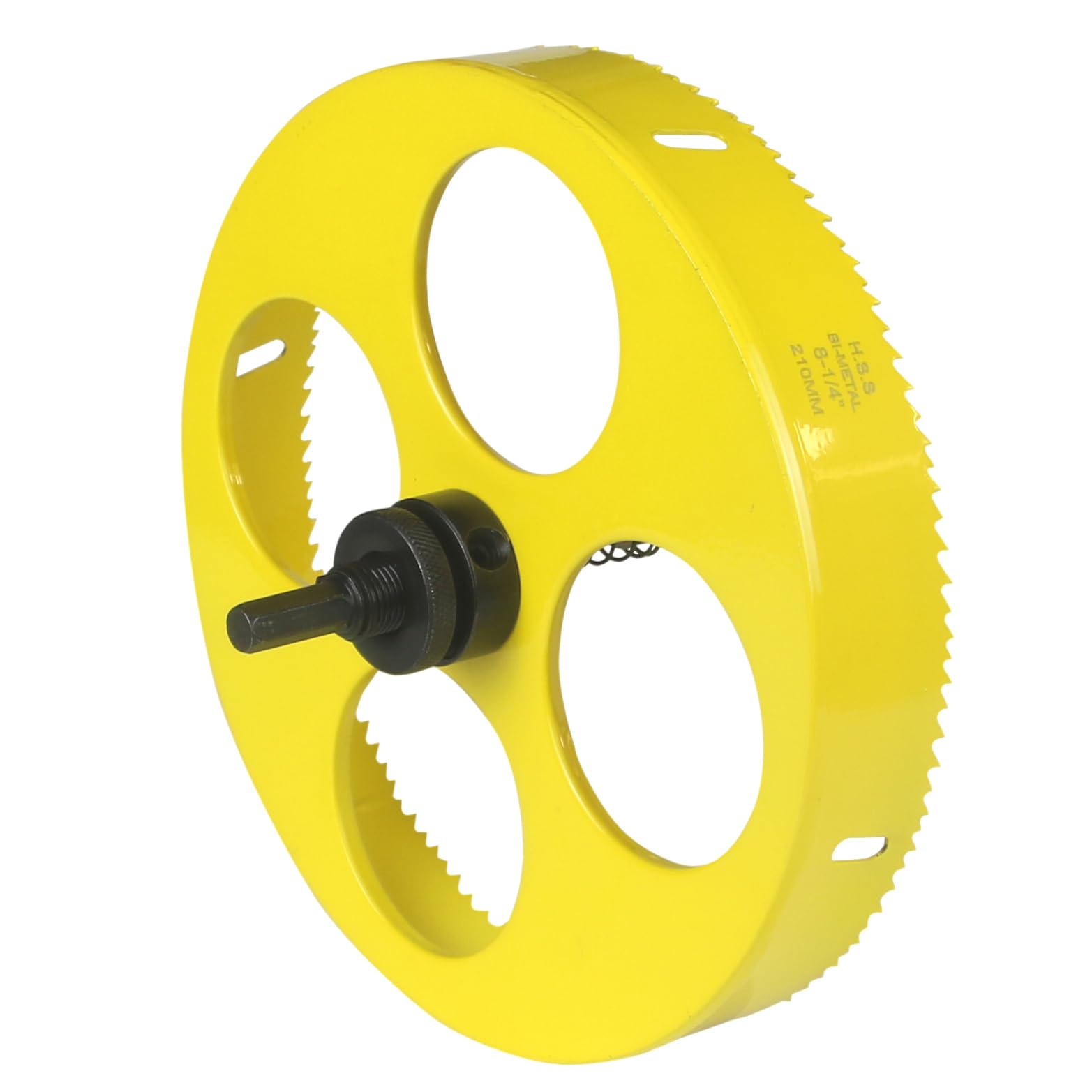 High grade hole saw 8-1/4 inch with 3/8'' Hex shank Mandrel,the cutting depth is about 1.24 inch (32mm),it can make 8-1/4 inch diamteter holes.