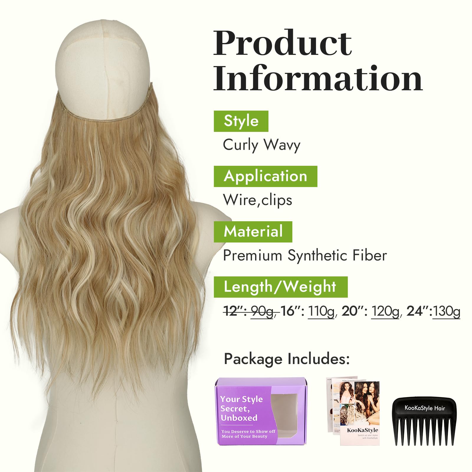 Specifications: Each package includes a hair piece containing 4 clips; 2 different lengths of fishing wire for replacement; You can adjust the suitable size according to your head circumference by putting the hook into the corresponding wire notches. The upgraded wire is thicker and more flexible, not easy to break and will not cause any stress to the scalp.
