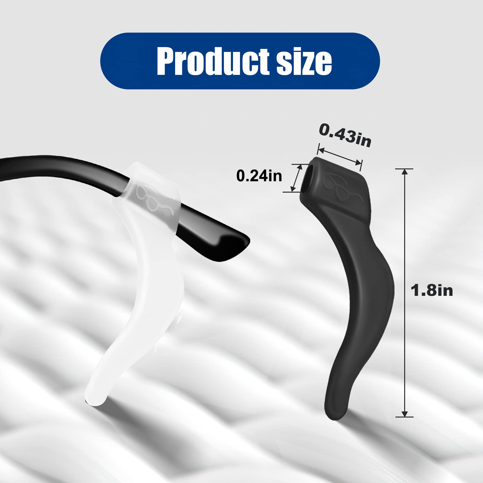 Size and Quantity: 4.2 * 1.1 * 0.25cm, you will get :10 pairs Black ,10 pairs Clear silicone ear grips of glasses.total 20 pairs eyeglass ear hook grips