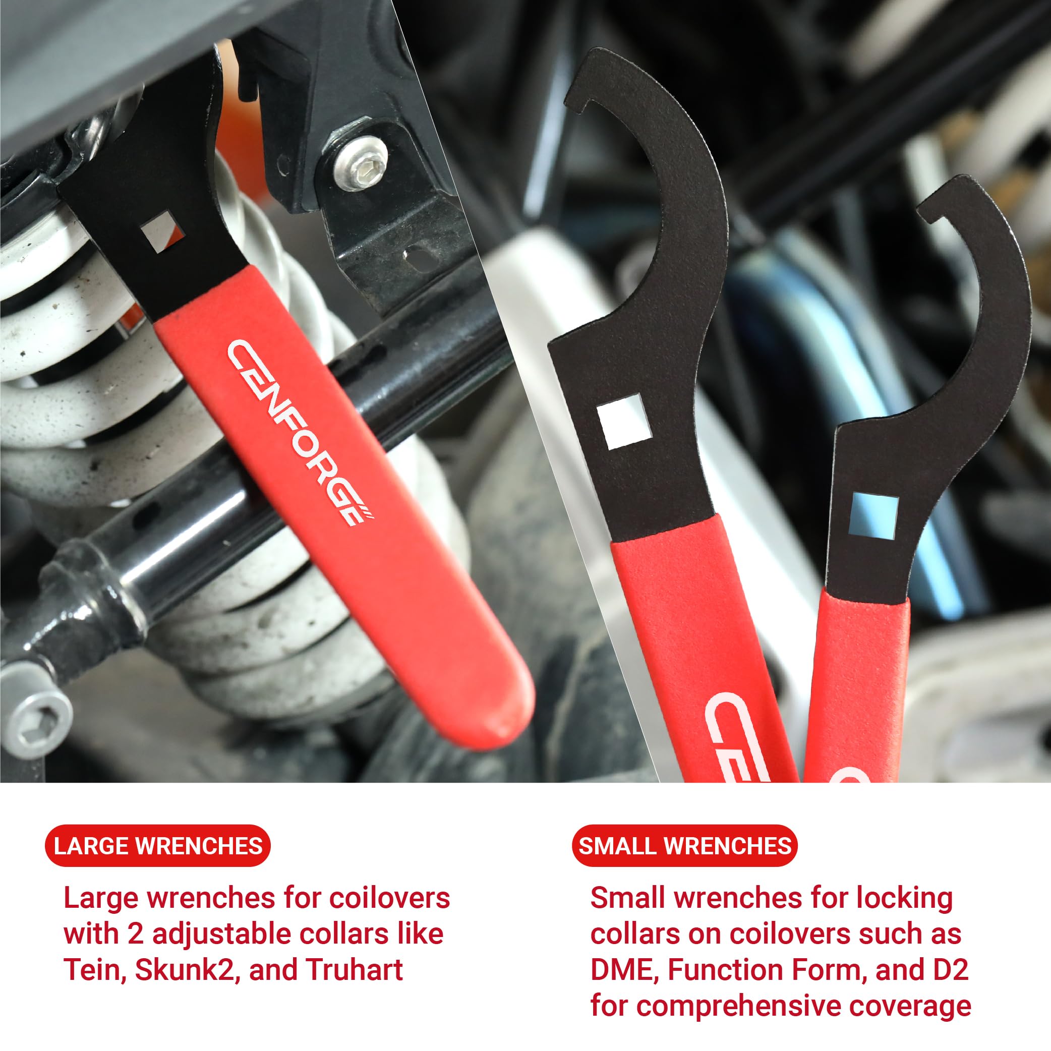 [Universal 4-Piece Suspension Kit] comprehensive set includes 2 large wrenches for adjustable collars (compatible with Tein, Skunk2, Truhart, KW, HKS, Apexi, Cusco) and 2 small wrenches for locking collars (compatible with DME, Function Form, D2). Ideal for cars, trucks, ATVs, UTVs, and motorcycles.