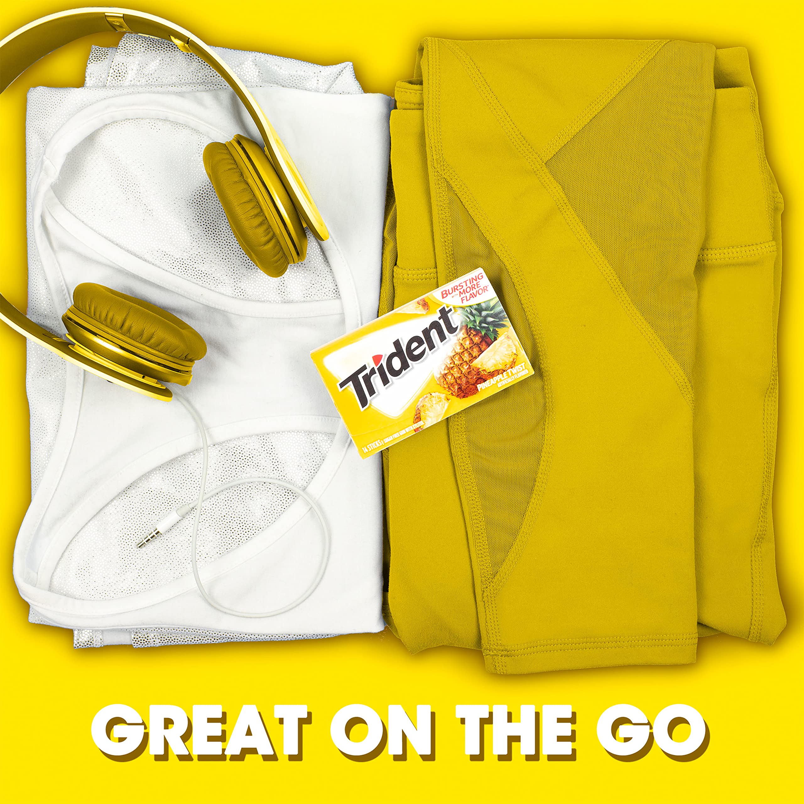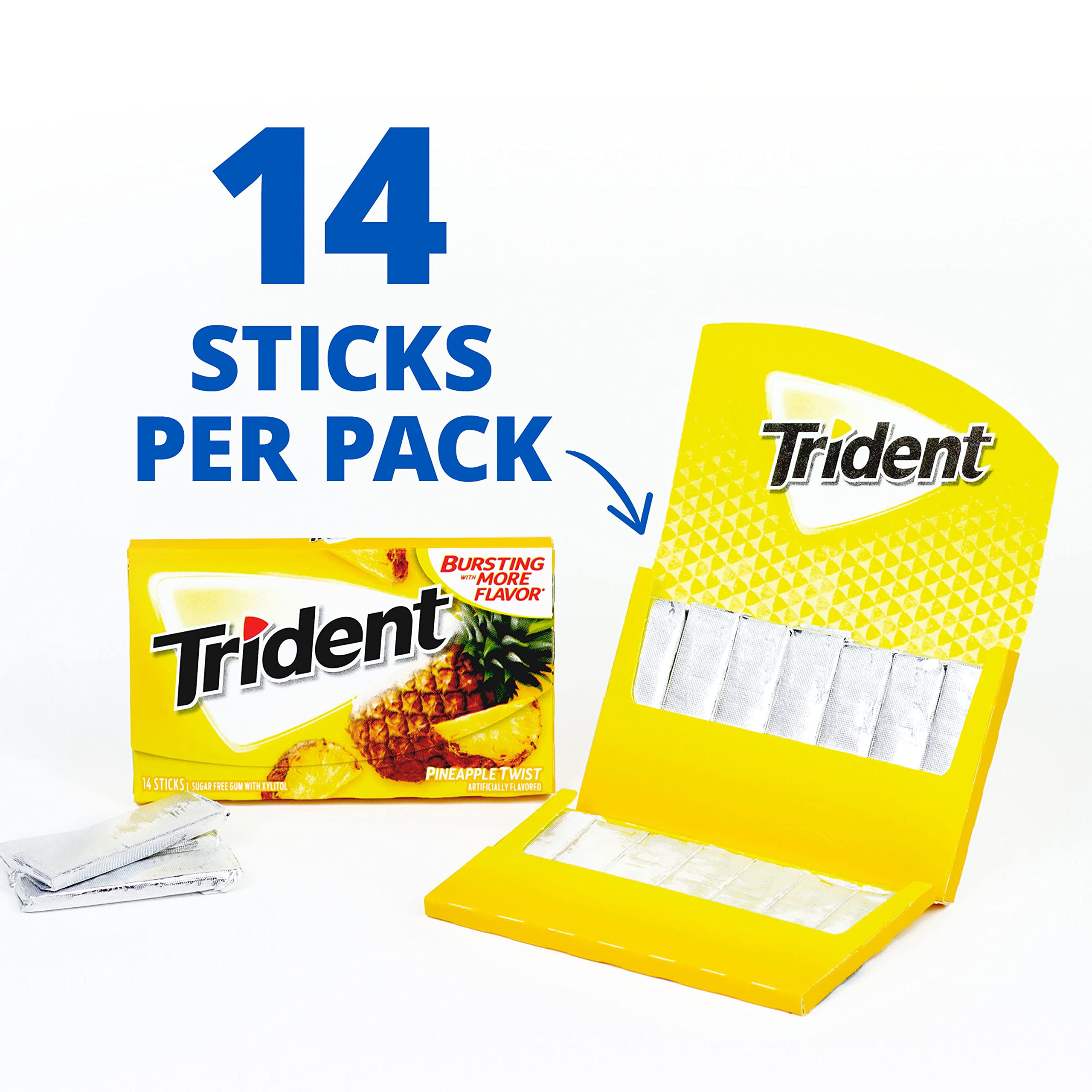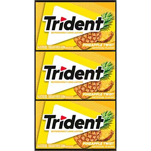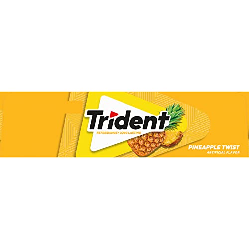 Trident Pineapple Twist Sugar Free Gum is a fruity and delicious way to freshen breath and protect your teeth. It's like pineapple flavor that's been spun around and around and around and around, and then stopped. With 30% fewer calories than sugared gum, Trident fruit gum is sweetened with xylitol, a naturally occurring sugar alcohol. The simple action of chewing Trident sugarless gum for 20 minutes after eating stimulates saliva flow to help prevent cavities and strengthen teeth, while also freshening your mouth with a burst of fruity flavor. Bulk gum packs give you plenty of Trident Twist sugar free gum to stock your company or small business, or hand out Trident pineapple gum as party favors or Halloween treats. Each individual pack of gum is designed so the Trident gum stays inside, making it easy to toss in your car, backpack or desk drawer. These sticks of pineapple gum are individually wrapped for extra freshness.