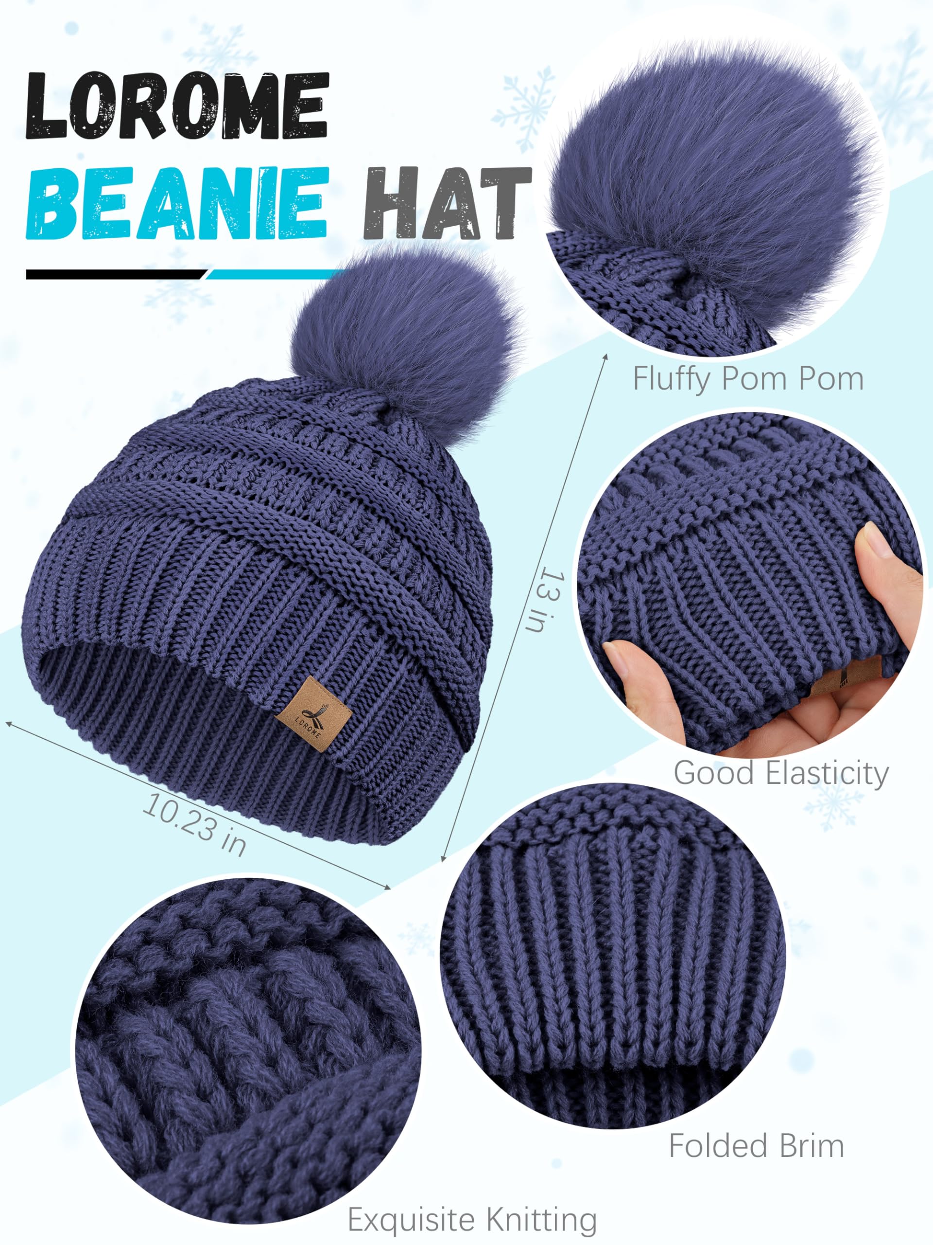 Special Design - These hat and glove set for women are notable for their inventive knitting tech, furry pom pom on hat, double layered and flanging brim design, stylish LOROME label, denim blue color, and thick cuff gloves designed for effortless touchscreen usage.