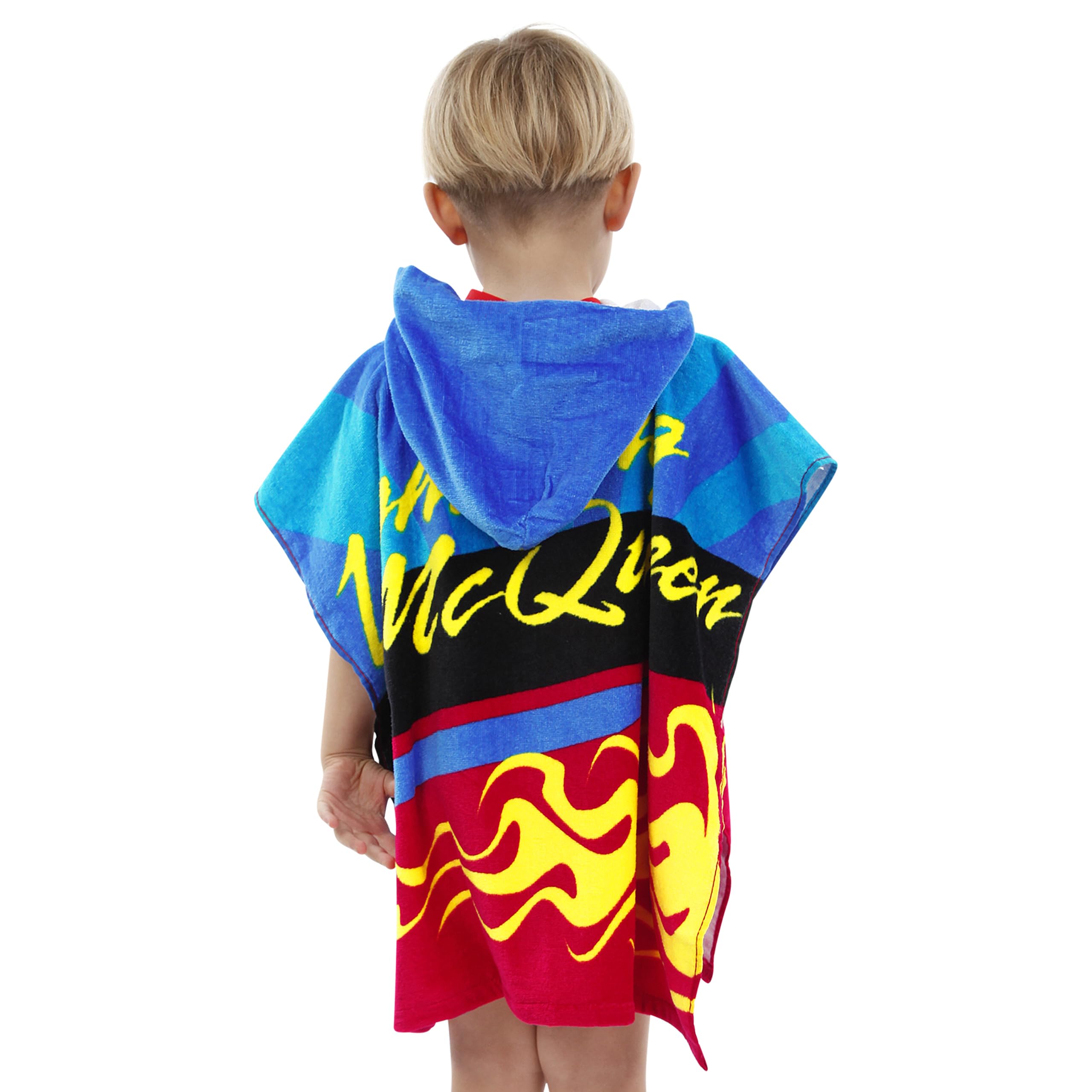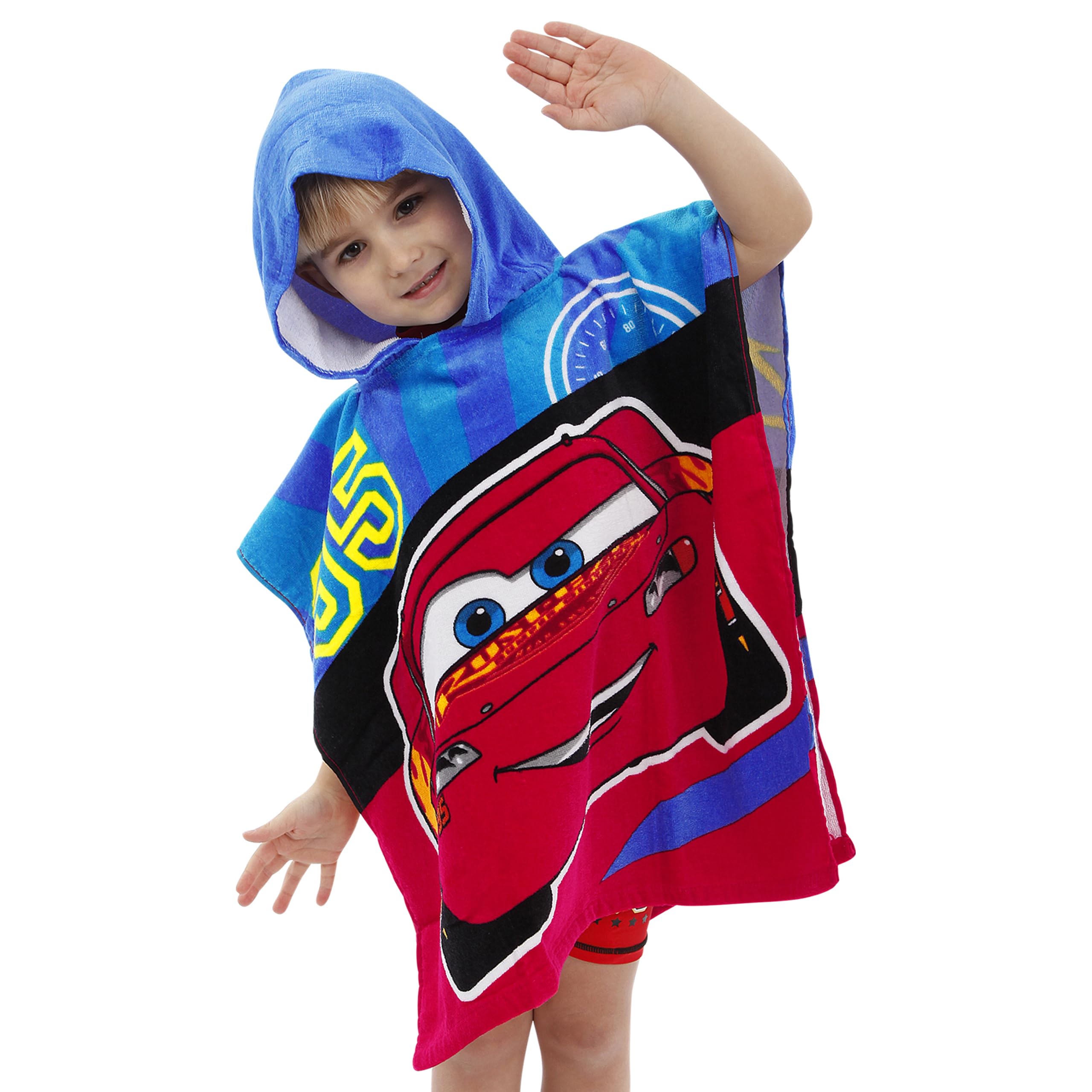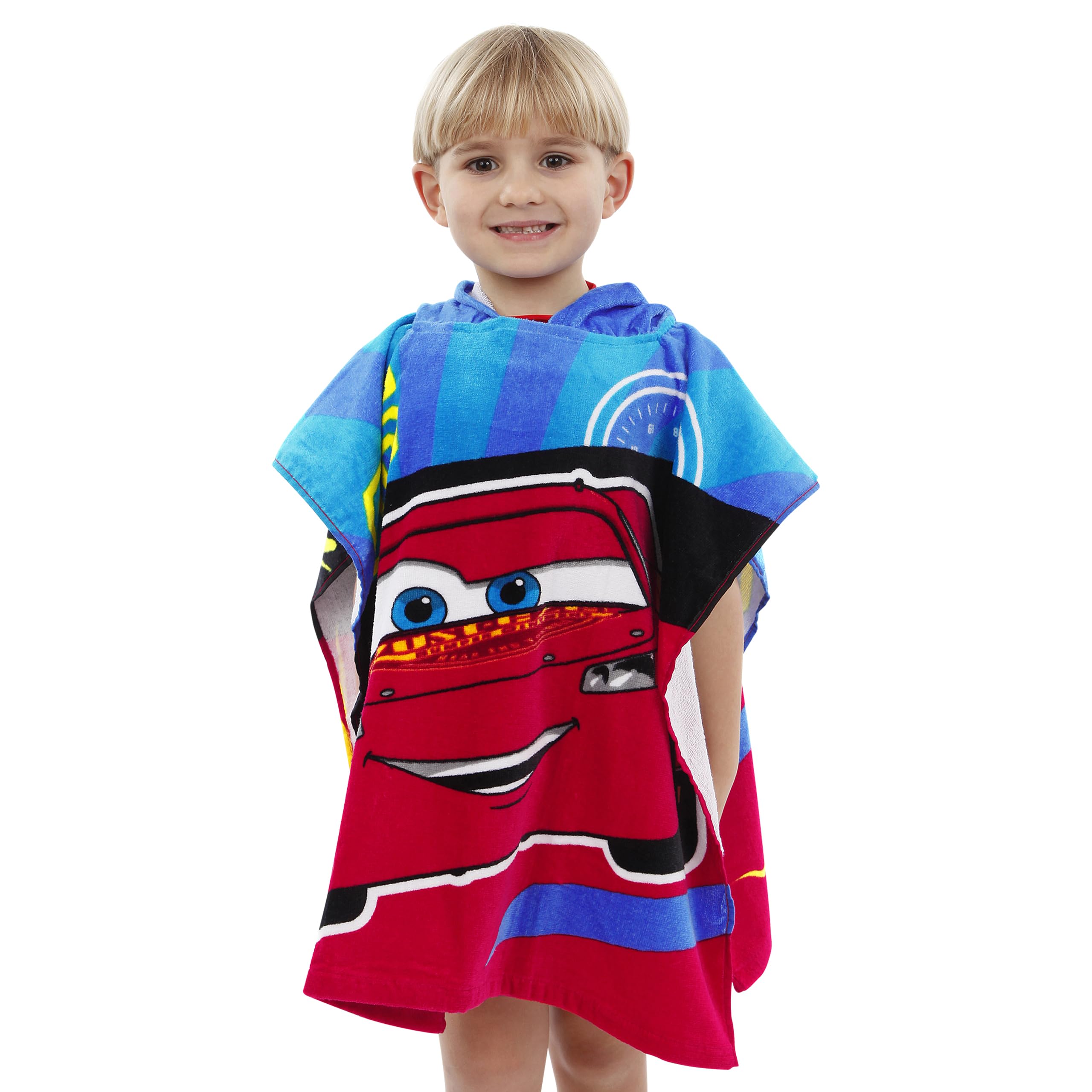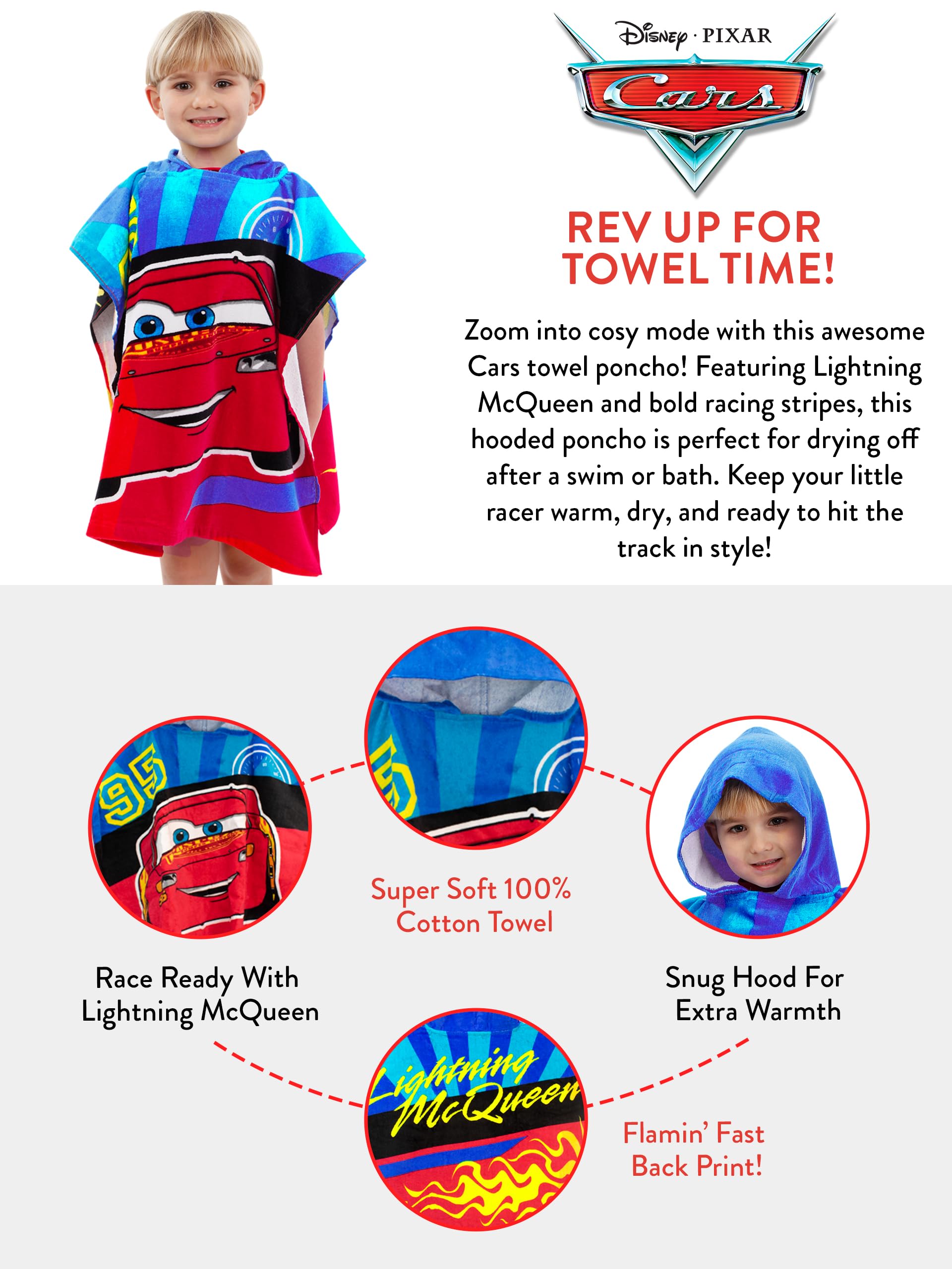 Boys Disney Cars Poncho. Get your little racer cosy and warm again after an awesome lightning-speed swim with this vibrant Cars towel poncho! This hooded poncho features Lightning McQueen with '95' on the front, while the back showcases a flame print and the wording 'Lightning McQueen' in bold yellow font. Your swimming champ will love to take this wearable towel to the pool or beach, ready for their next epic race!