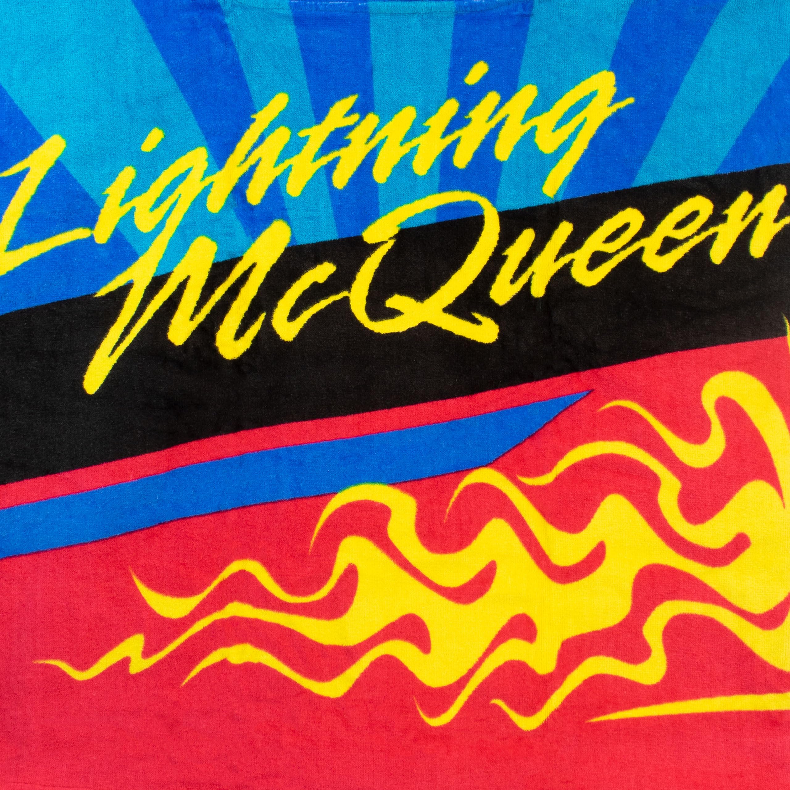 This striking red, blue and black towel poncho showcases Lightning McQueen with '95' printed on the front, while the back features a flame print and 'Lightning McQueen' in bold yellow font