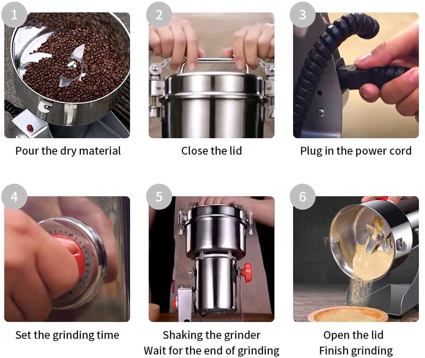 ❗ ❗ ❗ USE TIPS: 1. This grain grinder can only be turned on after the lid is fully buckled.2. The materials ready for grinding must be dry enough. 3. Rest the machine for 5-10 minutes after every 3 minutes operation. 4. Do not put the material over 2/3 of grinding bin. 5.Don't clean the grinding tank with the water directly. Keep water away the grinding tank and use dried rag or brush to clean the machine.