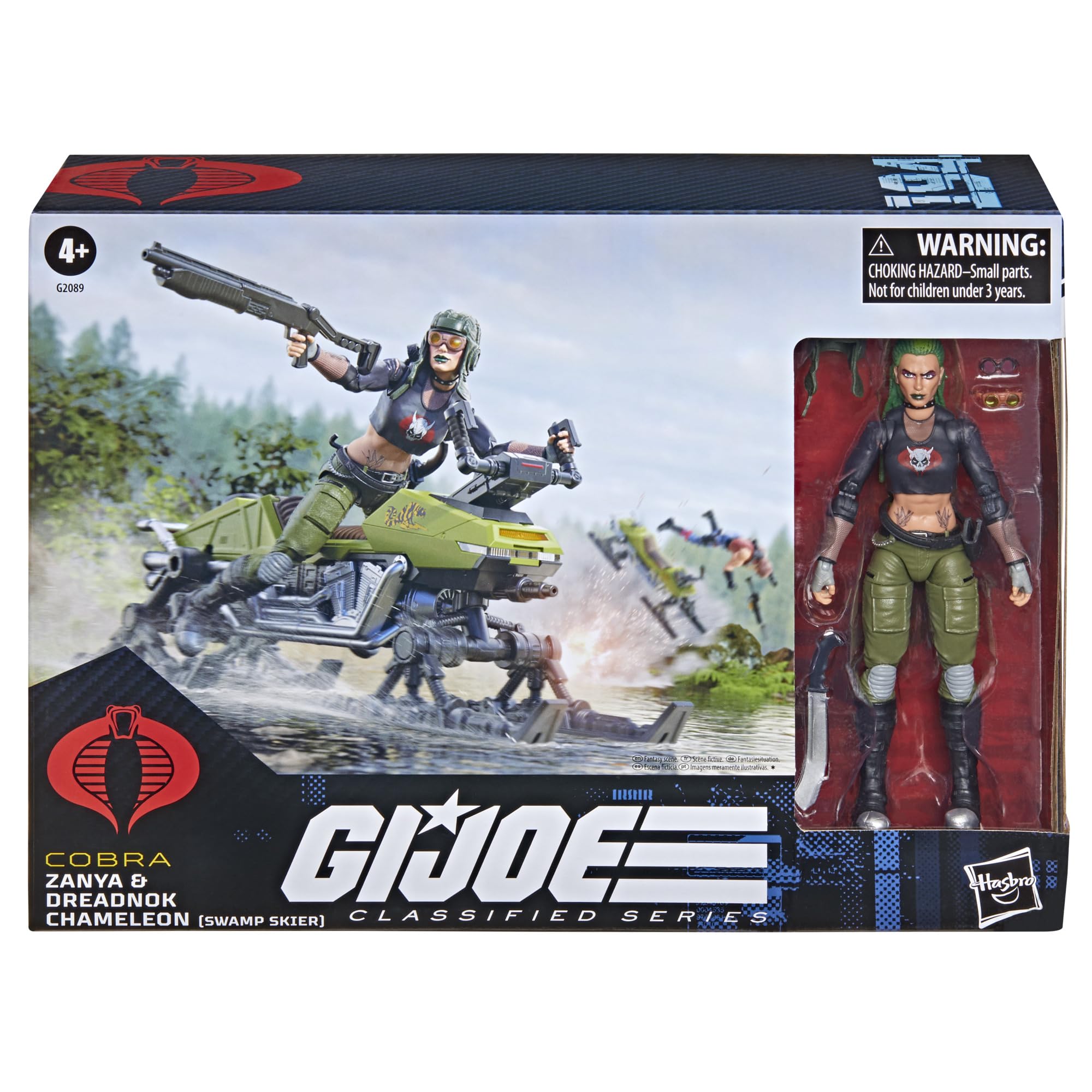 "G.I. Joe is a highly skilled, on-demand, special operations force of men and women from around the globe tasked with defending the world from Cobra, a ruthless criminal organization bent on total domination. The brave members of G.I. Joe are prepared to seek out Cobra in any environment on the planet. From hostile jungles to ice-clad arctic peaks...wherever there's trouble, G.I. Joe is there. New to the G.I. Joe Classified Series line, Zanya and Dreadnok Chameleon (Swamp Skier) Vehicle comes ready for adventure, with multiple points of articulation for high poseability. This Zanya figure contains 10 character-inspired accessory pieces including alternate masked head, helmet, goggles, glasses, 2 alternate hands, machete, backpack holster, and weapon accessories. The daughter of Zartan is tough, tenacious, and never gives an inch. That's how she can more than hold her own among the Dreadnoks. G.I. JOE and HASBRO and all related trademarks and logos are trademarks of Hasbro, Inc."