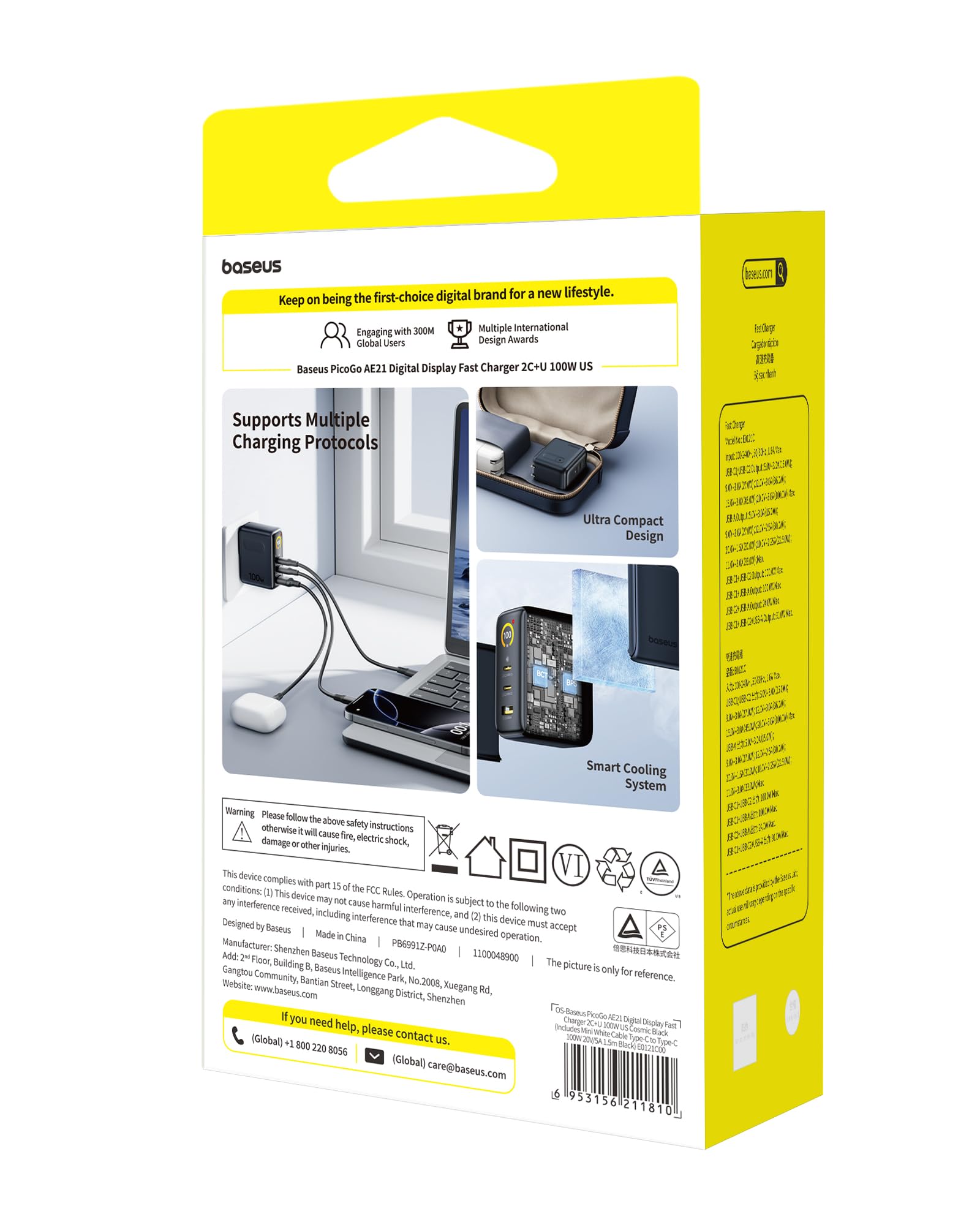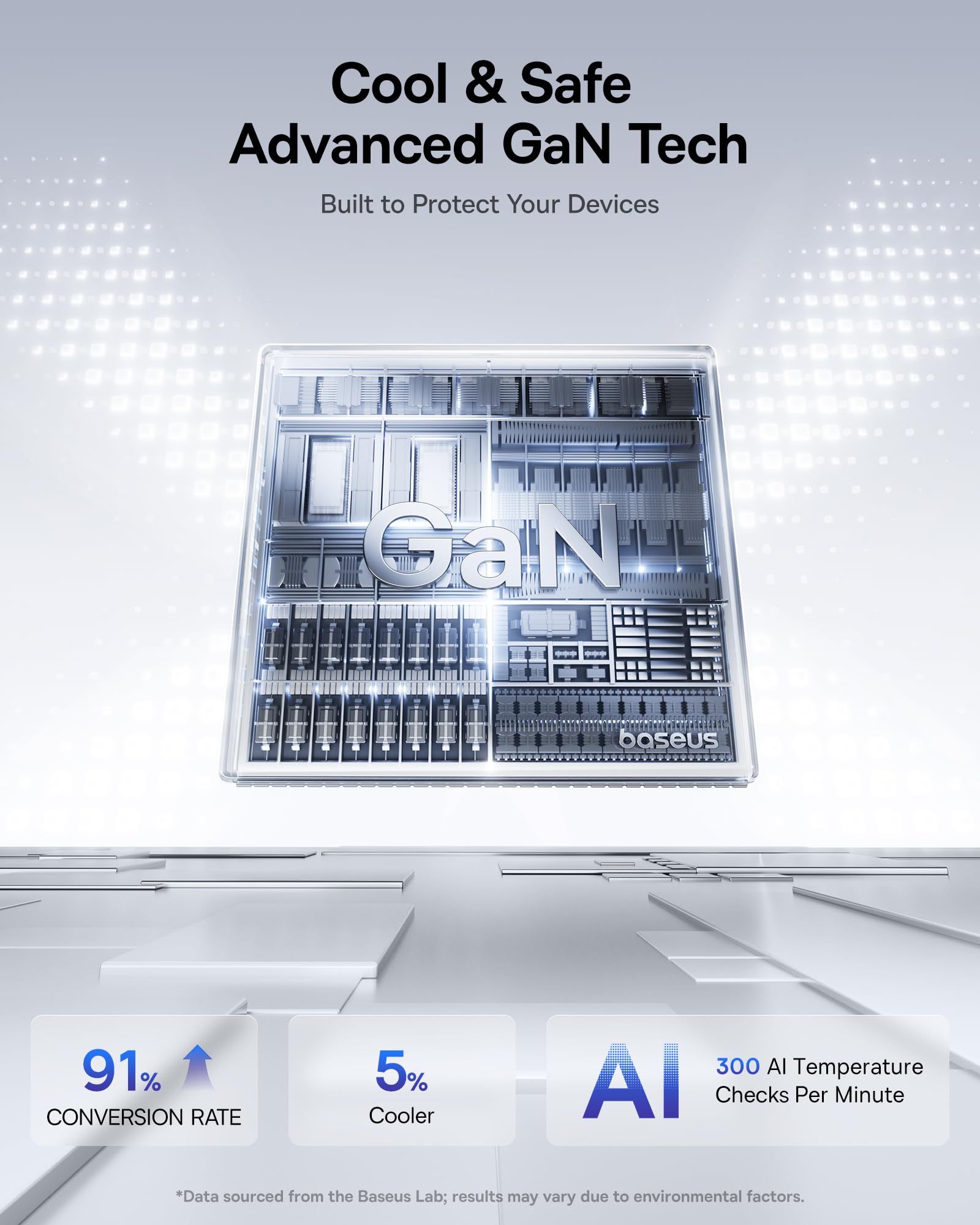 Effective Temperature Drop: Designed with advanced GaN technology for higher efficiency and lower heat, and AI-powered Baseus Cooling technology (BCT) temperature monitoring 2000 times per second for reliable device protection.