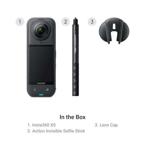 In The Box: 1× Insta360 X5 (Standalone Bundle), 1x Lens Cap, 1x Action Invisible Selfie Stick. *MicroSD Card sold separately.