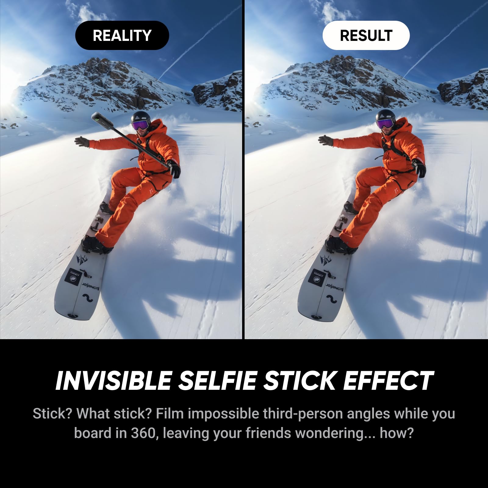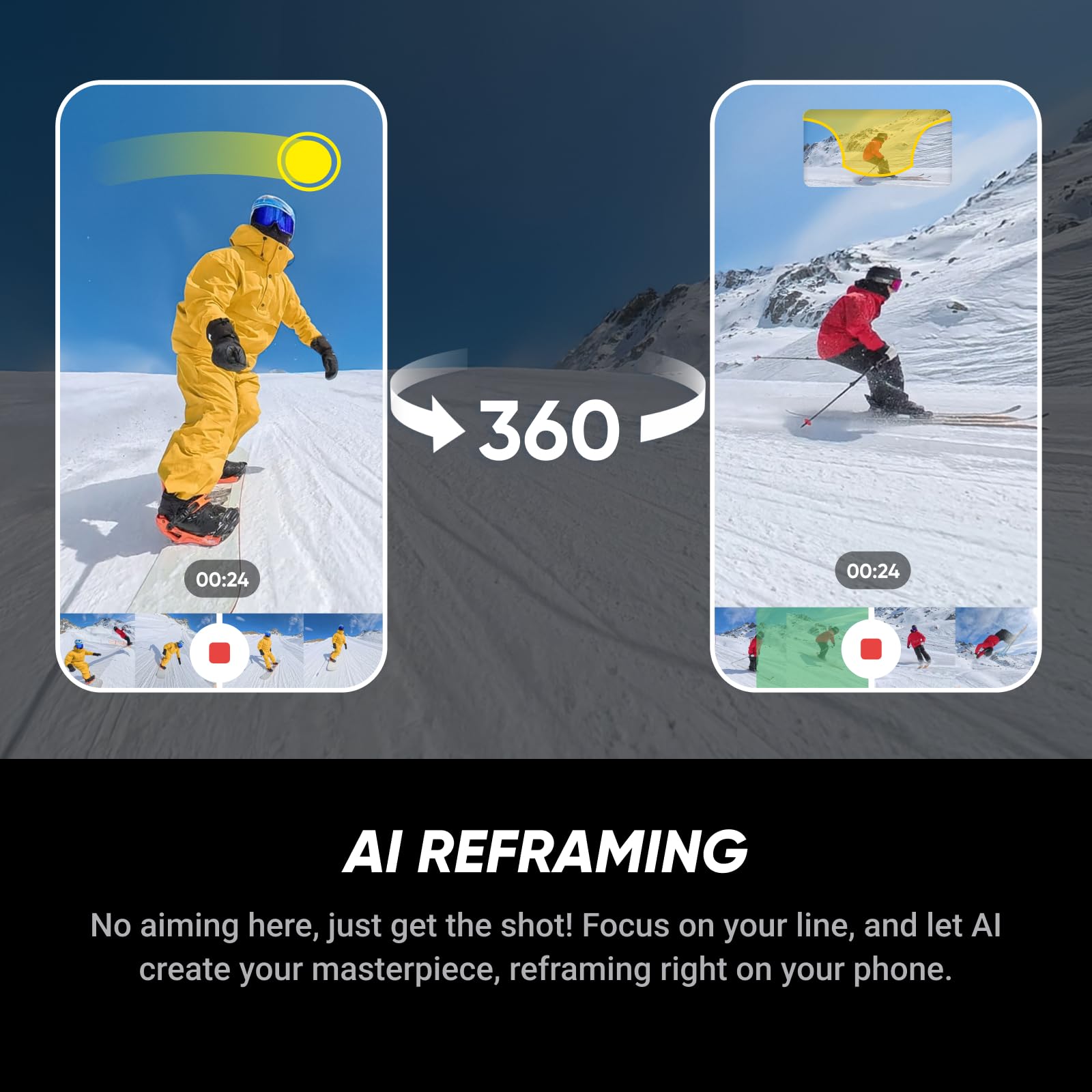 Invisible Selfie Stick: Create impossible third-person views with no selfie stick in sight! Capture everything in 360°, then choose your angles later using AI-assisted reframing—perfect shots, every time.