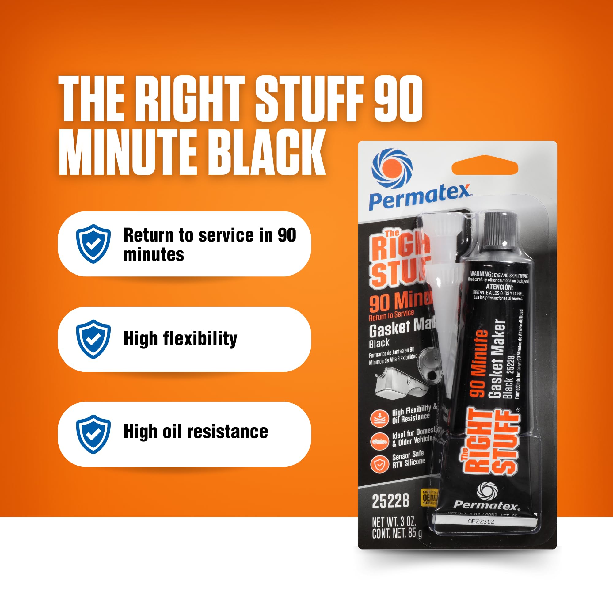 Are you tired of waiting to road test a vehicle once the job is done? Ever had to hold a customer’s car overnight just to ensure your silicone applications fully cured? Well wait no longer – Introducing The Right Stuff 90 Minute Gasket Maker from Permatex. This superior product not only outperforms conventional pre-cut gaskets, but also cures in just 90 minutes. This is the only silicone on the market available in a squeeze tube that allows record return to service time. The Right Stuff 90 Minute Gasket Maker was formulated to provide a strong and fast high flex silicone seal that offers excellent durability.