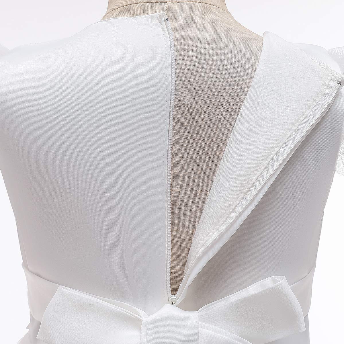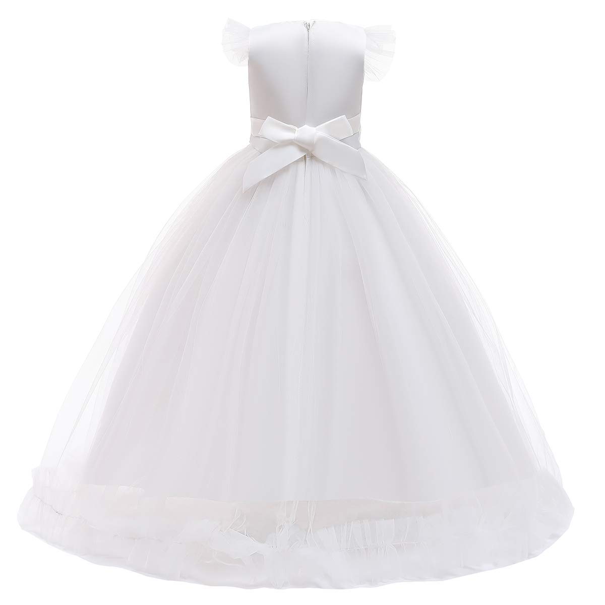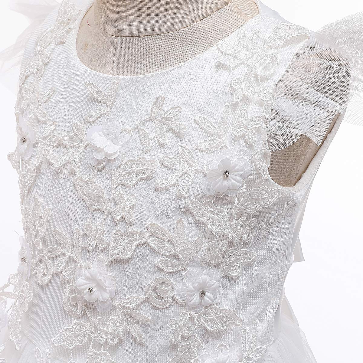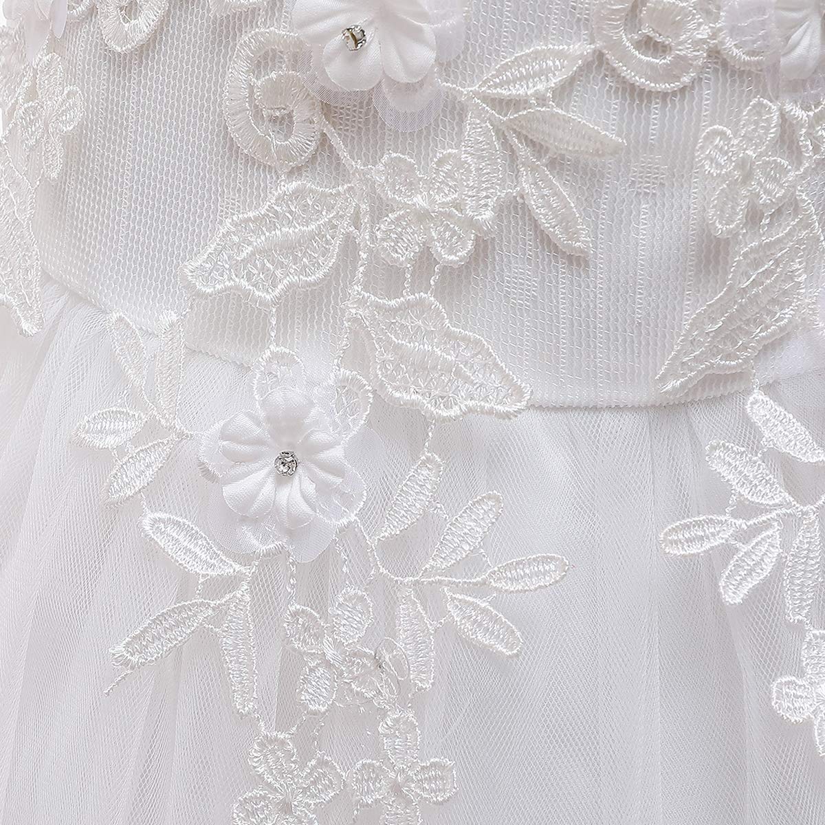 Mesh spliced bodies with soft lining, adds ruffled tulle details at sleeve, tops embellished with beautiful flower, faux rhinestone and embroidered patchwork at front,Designed with concealed zip-back fastening, the sashes are attached at the side seams and can be tied a bowknot at back.This dress contains 2 layers tulle, 2 layers soft lining, and 1 layer netting attached on the innermost fabric adds to a fuller look