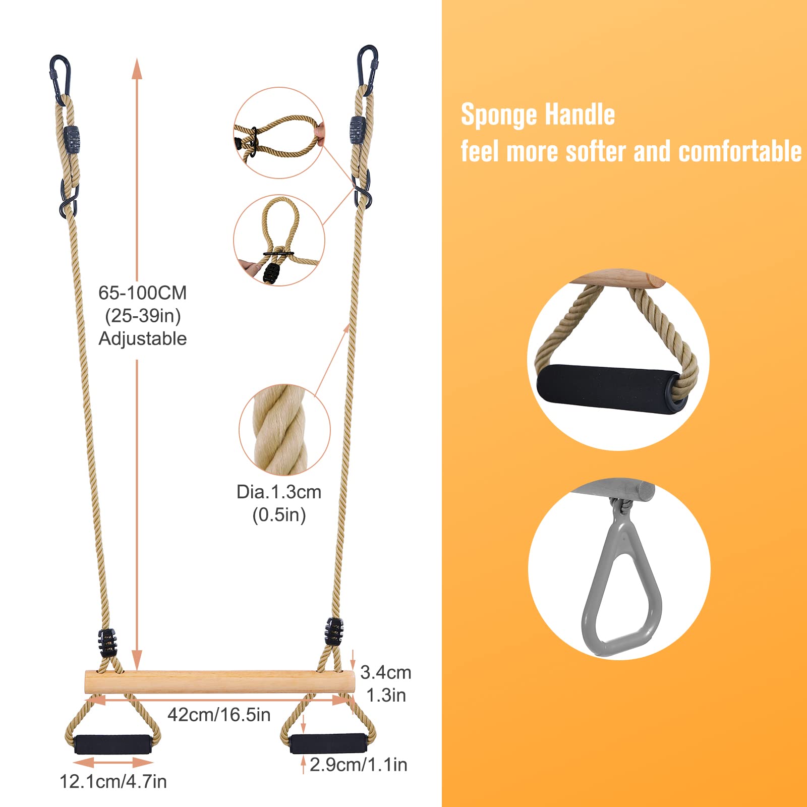 Material-The wood of the trapeze swing is made of solid pine wood with soft sponge handle(more softer and comfortable ).The rope of the swing is hemp rope which is soft and easy to tie, light quality.The swing is safe and reliable and can support 100 kg.