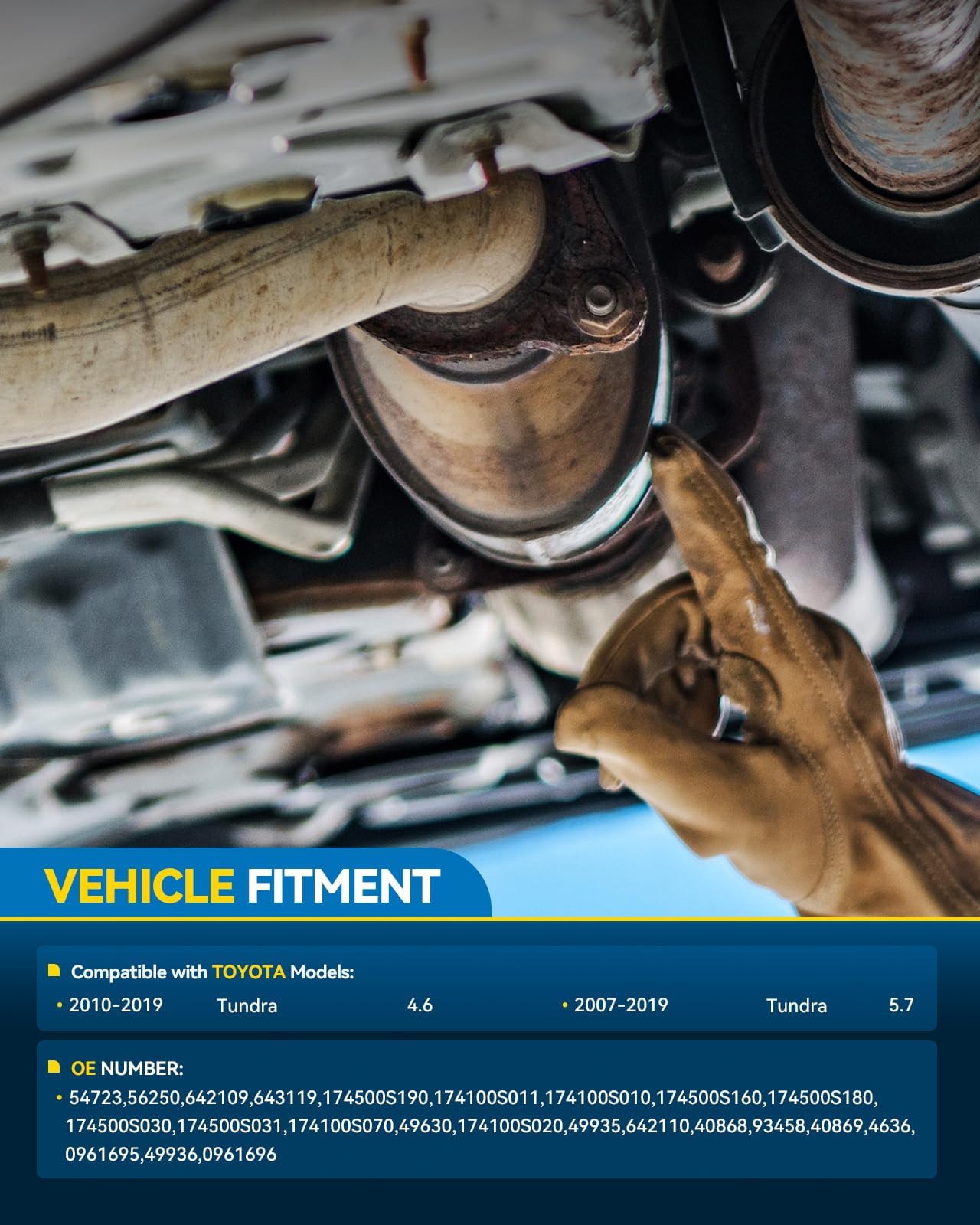 COMPATIBILITY : Catalytic converters fit for 2007-2019 Tundra 4.6/5.7L. Reference Number: 56250, 643119, 40868, 54723, 642109, 40869.These free-flow catalytic converters have bolt-on connections and flange to flange design for effortless installation.