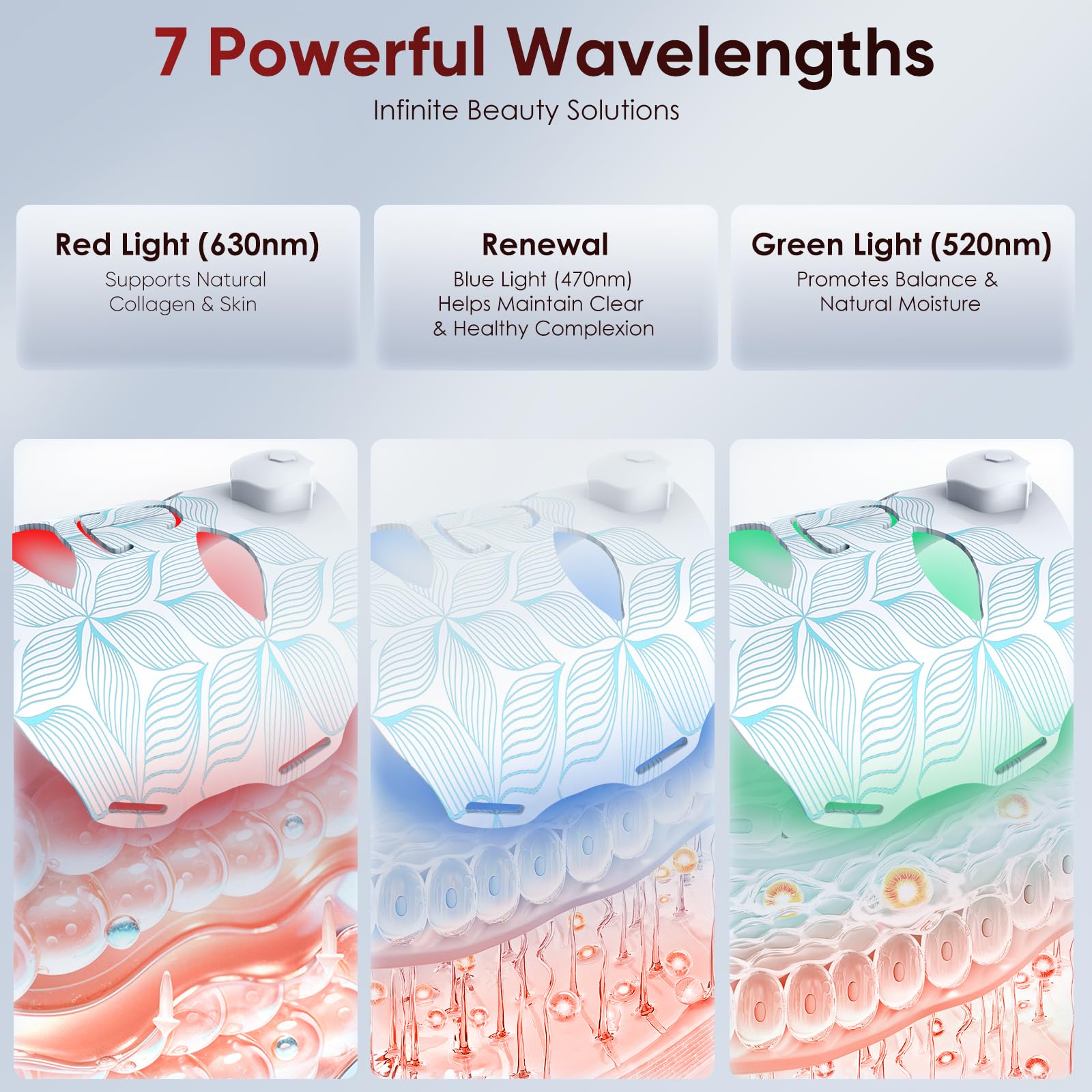 Advanced 7-Color Light Technology: Our LED face mask features 180 LED beads with 7 specialized wavelengths (400-630nm). Each color delivers unique skincare benefits: Red light(630nm) enhances skin elasticity, Blue light soothes skin, while other wavelengths work together for comprehensive facial care. Easy one-click control cycles through 7 therapeutic modes.