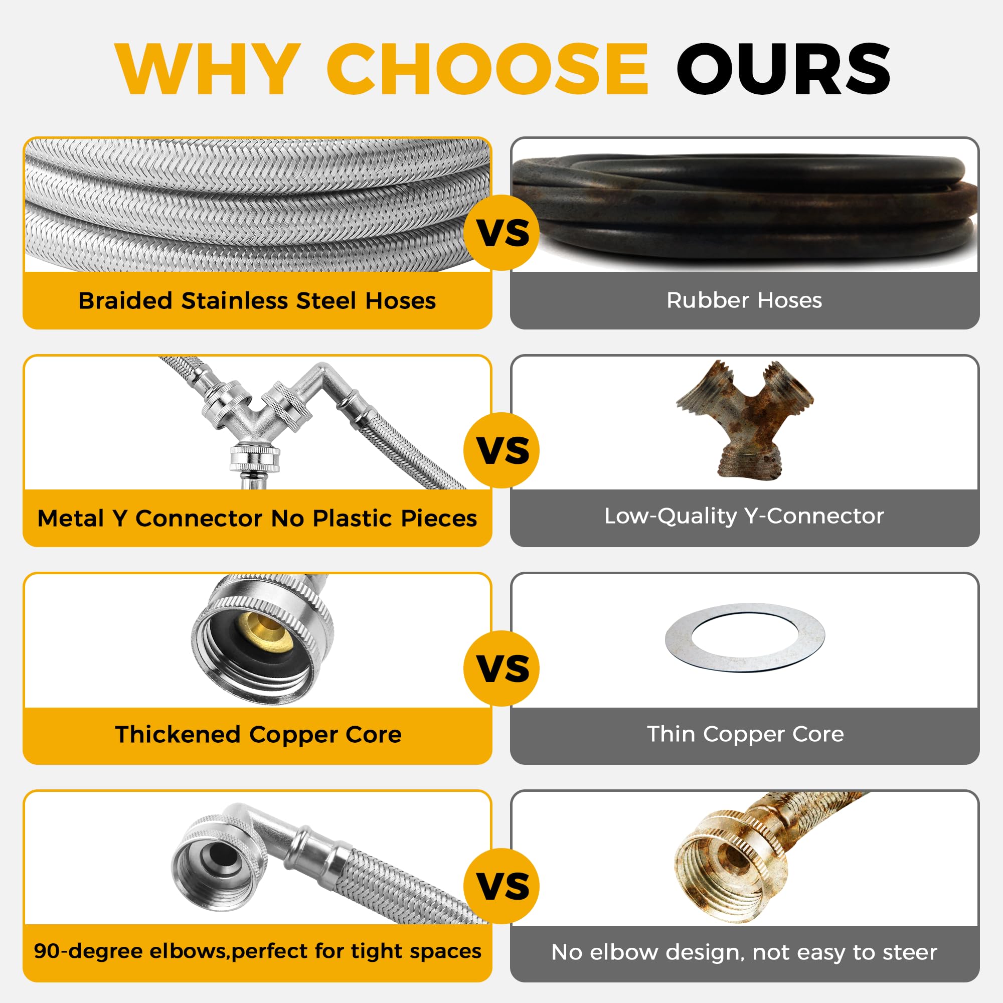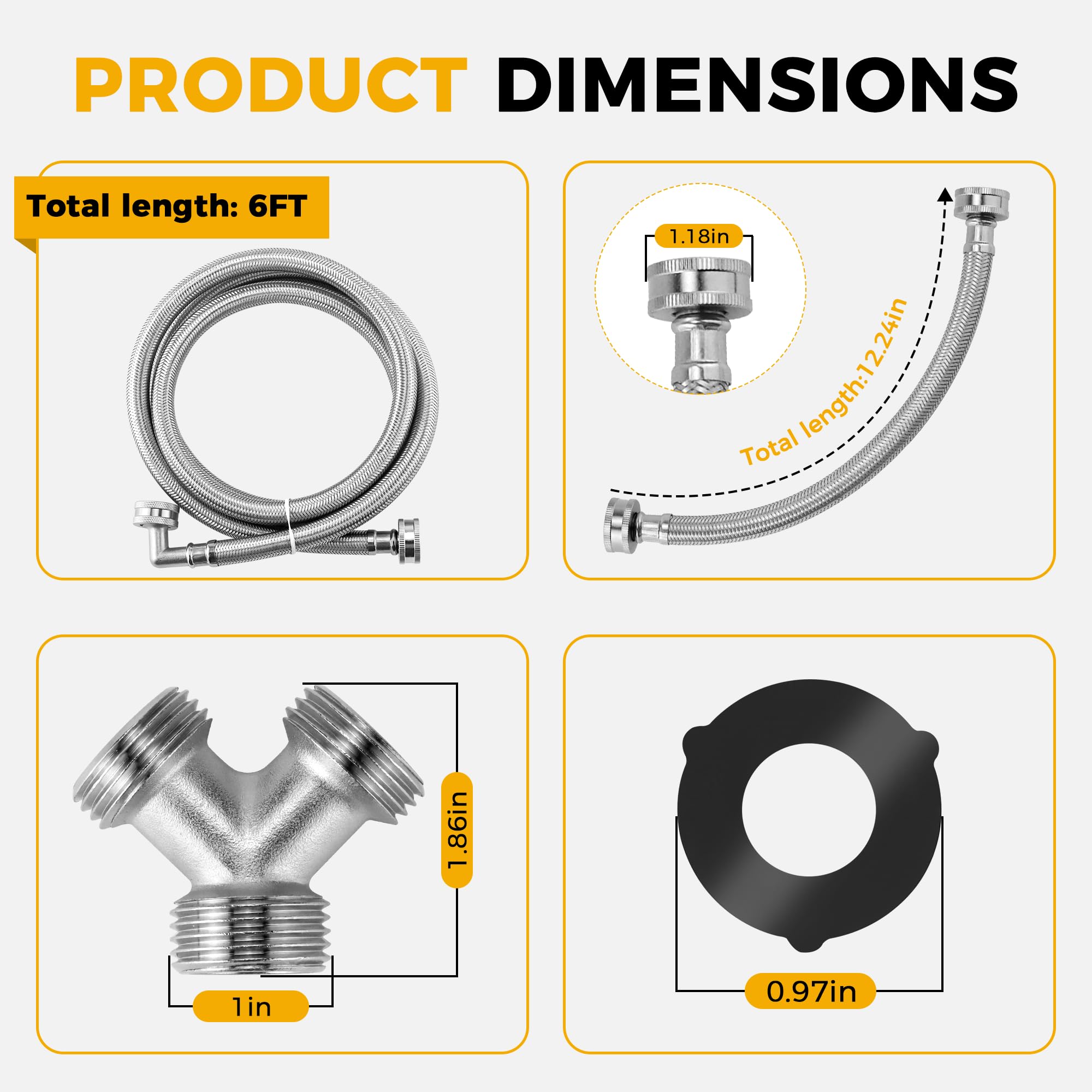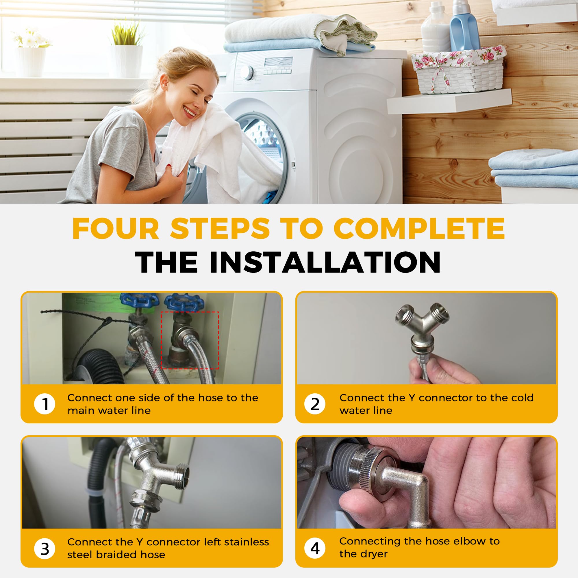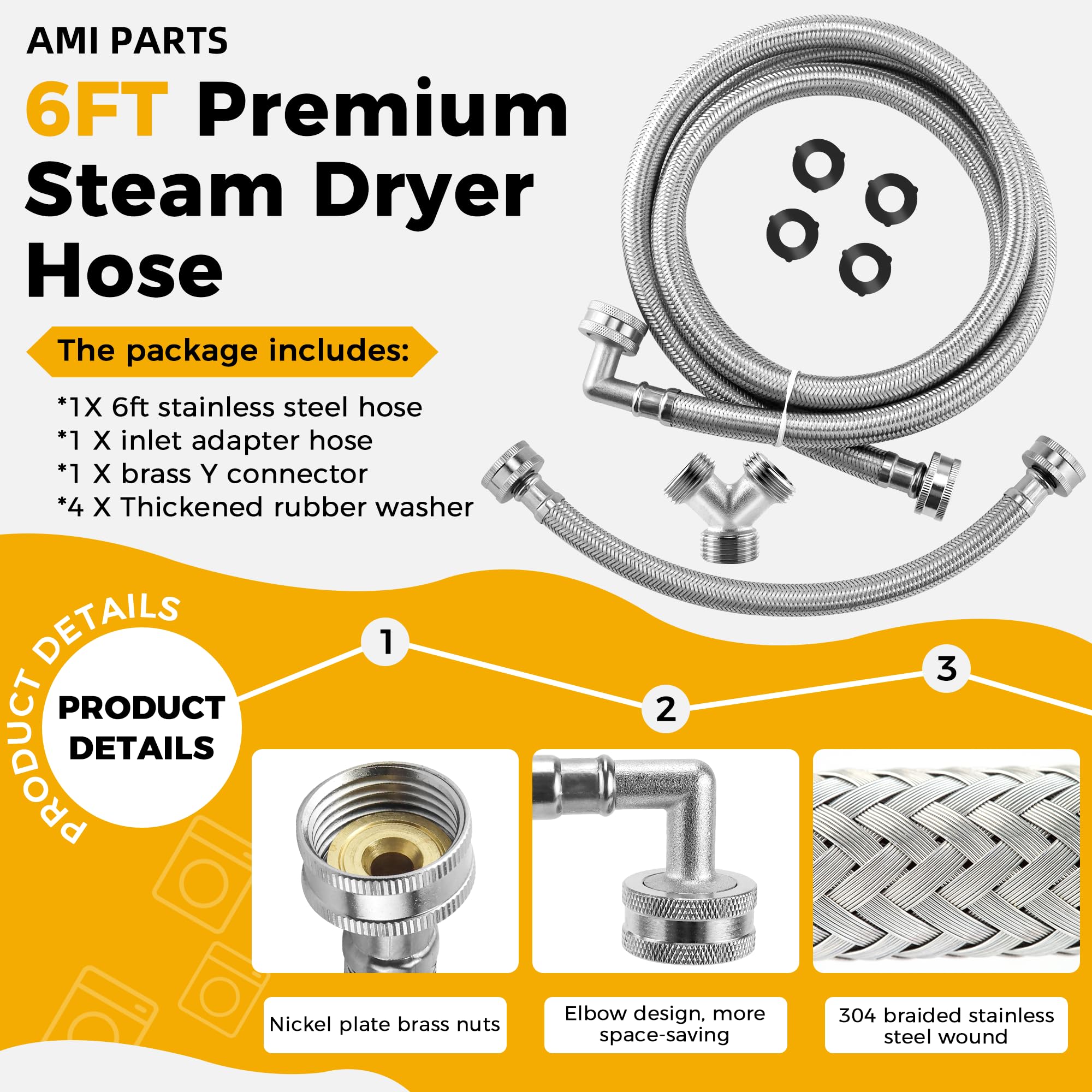 [STEAM DRYER HOSE INSTALLATION KIT]: Steam dryer hose kit Includes 1 x 6 Ft stainless steel 304 hose (3/4 inch FHT connection) with 90 Degree "Space Saver" elbow, 1 x 1 Ft inlet adapter hose(3/4" FGH x 3/4" MGH), 1 x brass Y connector and 4 x rubber washers.6 ft steam dryer hose with 90-deg elbow ensures easy installation in tight spaces and helps prevent kinking. Rubber washers prevent leaks from occurring. This is a steam dryer hose kit that includes everything you need to install your steam dryer