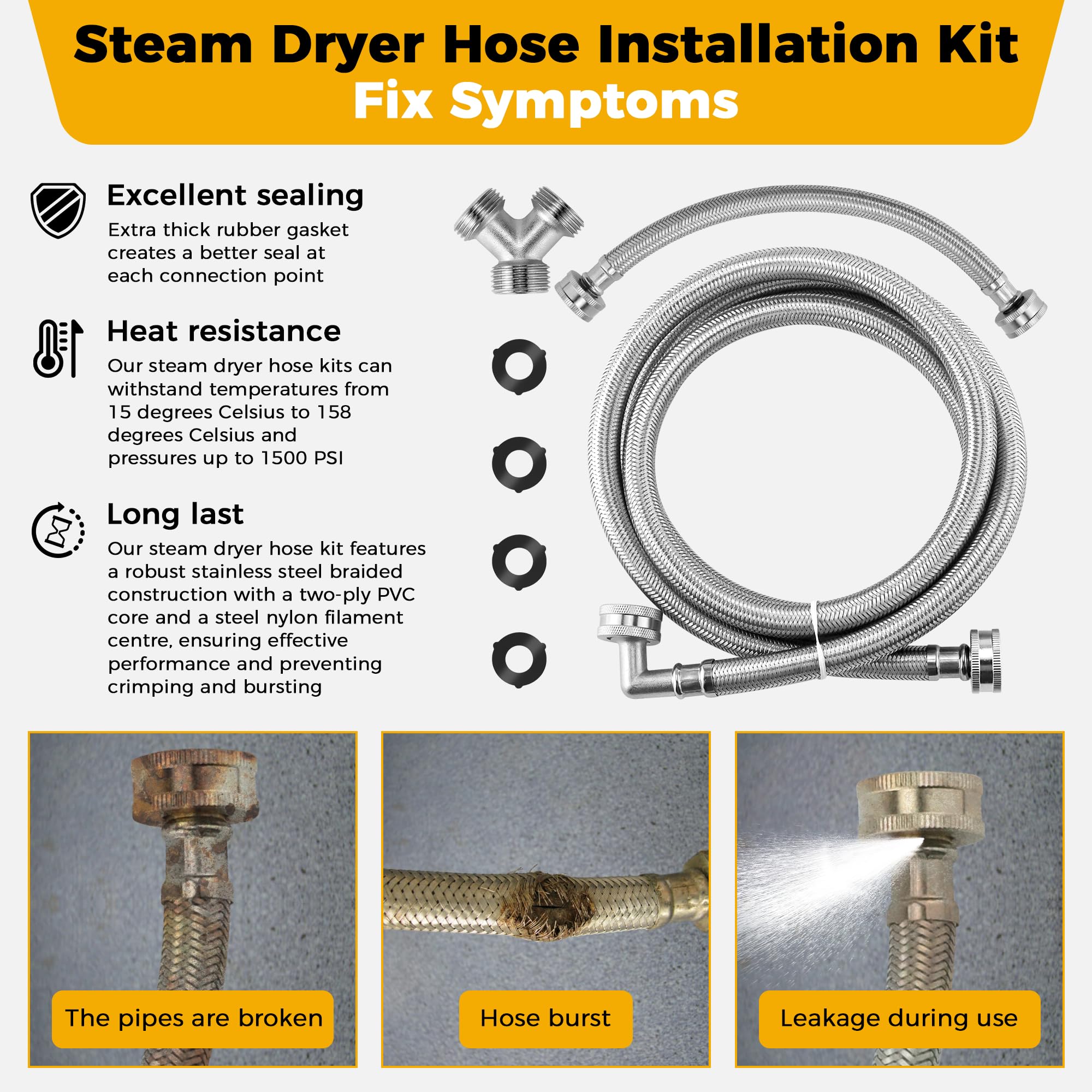 [HIGH QUALITY STEAM DRYER HOSE]: Our premium steam dryer hose kit features rugged 304 braided stainless steel construction withstands temperatures from 15 degrees Celsius to 158 degrees Celsius and pressures up to 1500 PSI.PVC core with rubber washers resist abrasion, corrosion and leakage.The 304 grade stainless steel hose prevents bursting, curling and kinking.Our 6 Ft stainless steel hose are designed to give you a better experience when you use them