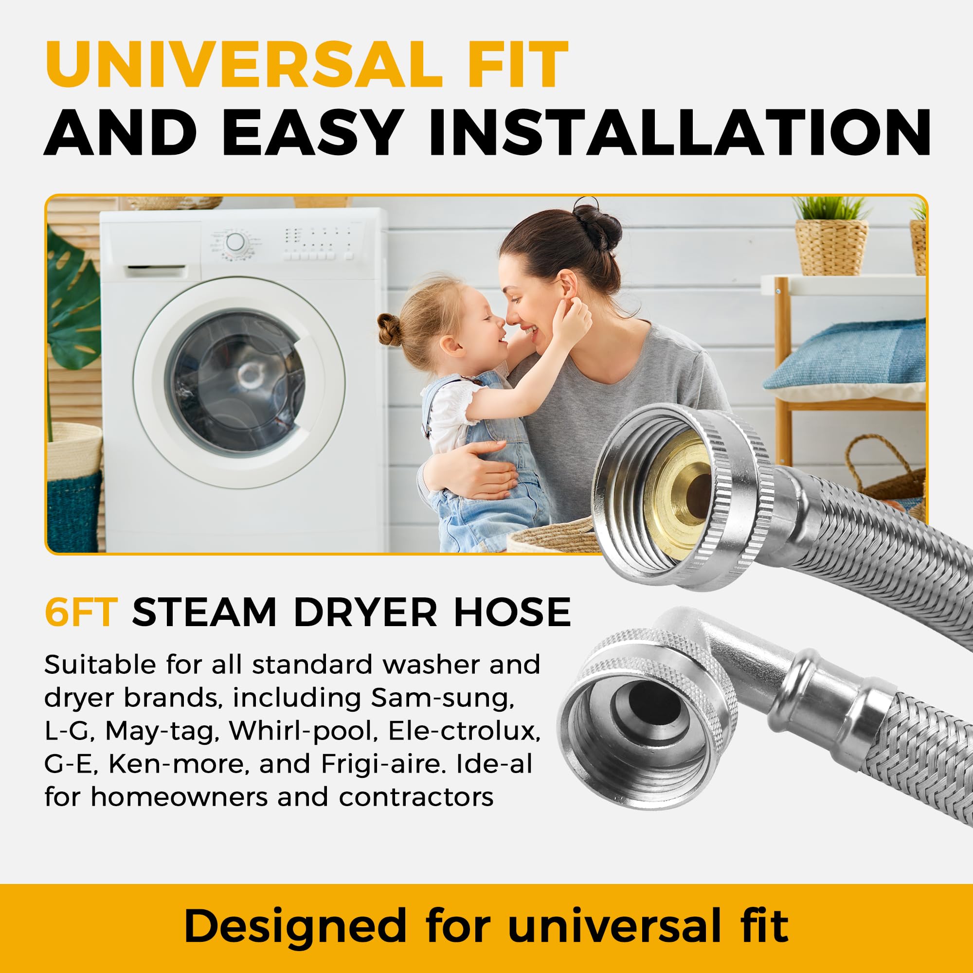 [UNIVERSAL FITS]: Our steam dryer installation kit universal fits for all steam dryer brands - Our hose connects securely to any standard steam dryer and standard supply pipework and includes gaskets. This dryer steam hose kit is suitable fit for residential or commercial use. Compatible with all major brands of washers and dryers,including fit for Sam-sung, L-G, May-tag, Whi-rlpool, G-E, Ken-more, Ele-ctrolux and Frigi-aire