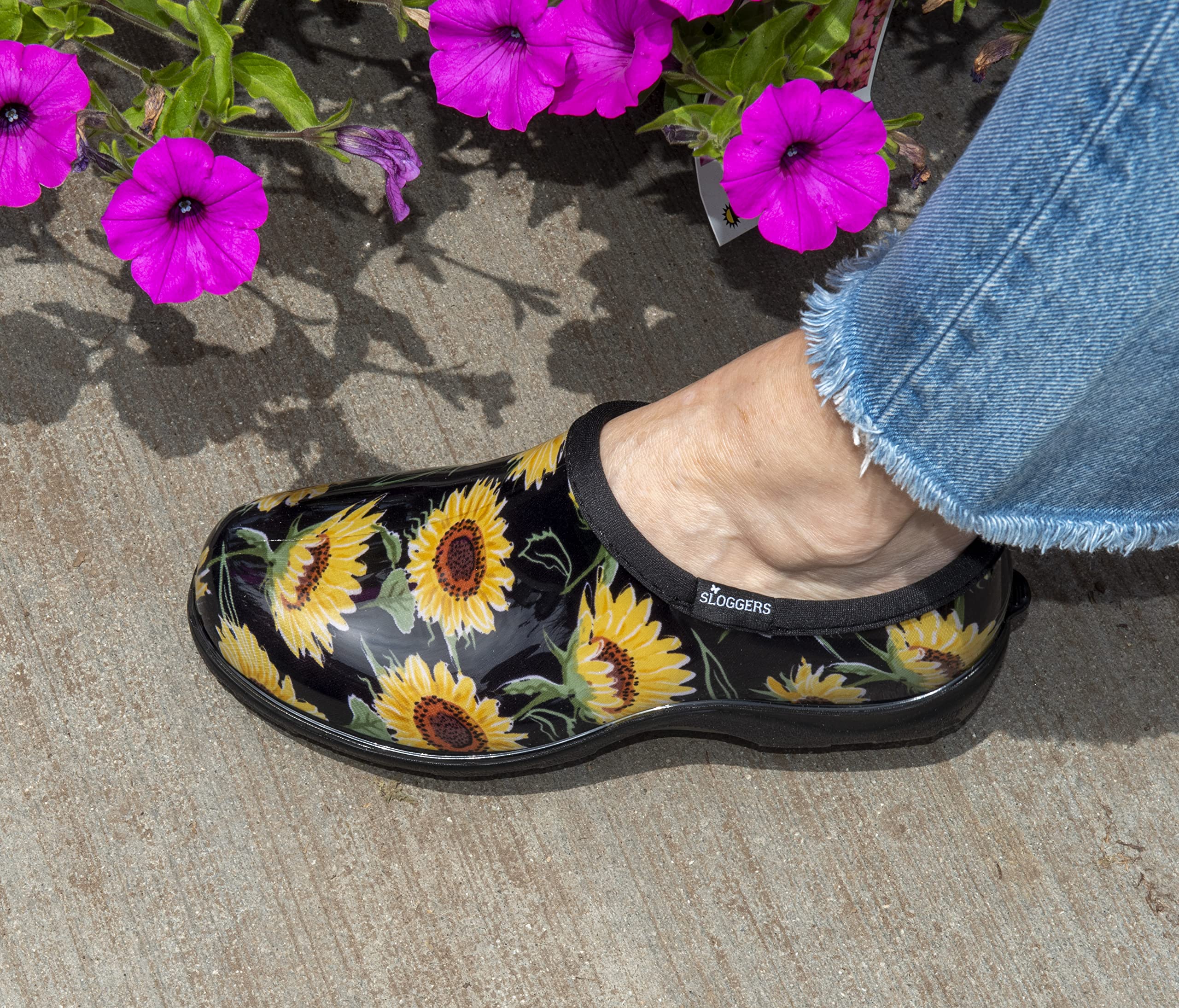 Description Product Description Designed with a honeycomb heel section that not only reduces weight, but also adds a spring to your step. Sloggers clogs, shoes, ankle boots and rain boots come with “All-Day Comfort” premium insoles to keep your feet supported all day. Sloggers signature deep lug tread provides the same stability and support as a real work boot. Made with 90% recycled material. Sloggers are easy to care for and clean. Hose them off or wash off in the sink. Remove insole to airdry. Amazon.com Cultivate all the enjoyment you can from your garden in the Midsummer garden shoe from Sloggers. Brilliant floral design meets mud- and puddle-proof construction so you can get out there after a refreshing spring shower and stay decidedly un-soggy. A low-cut ankle offers range of motion for easier kneeling and squatting as you work the soil. From the Manufacturer Women's Garden Shoe Midsummer, 6, (Black), Ea.
