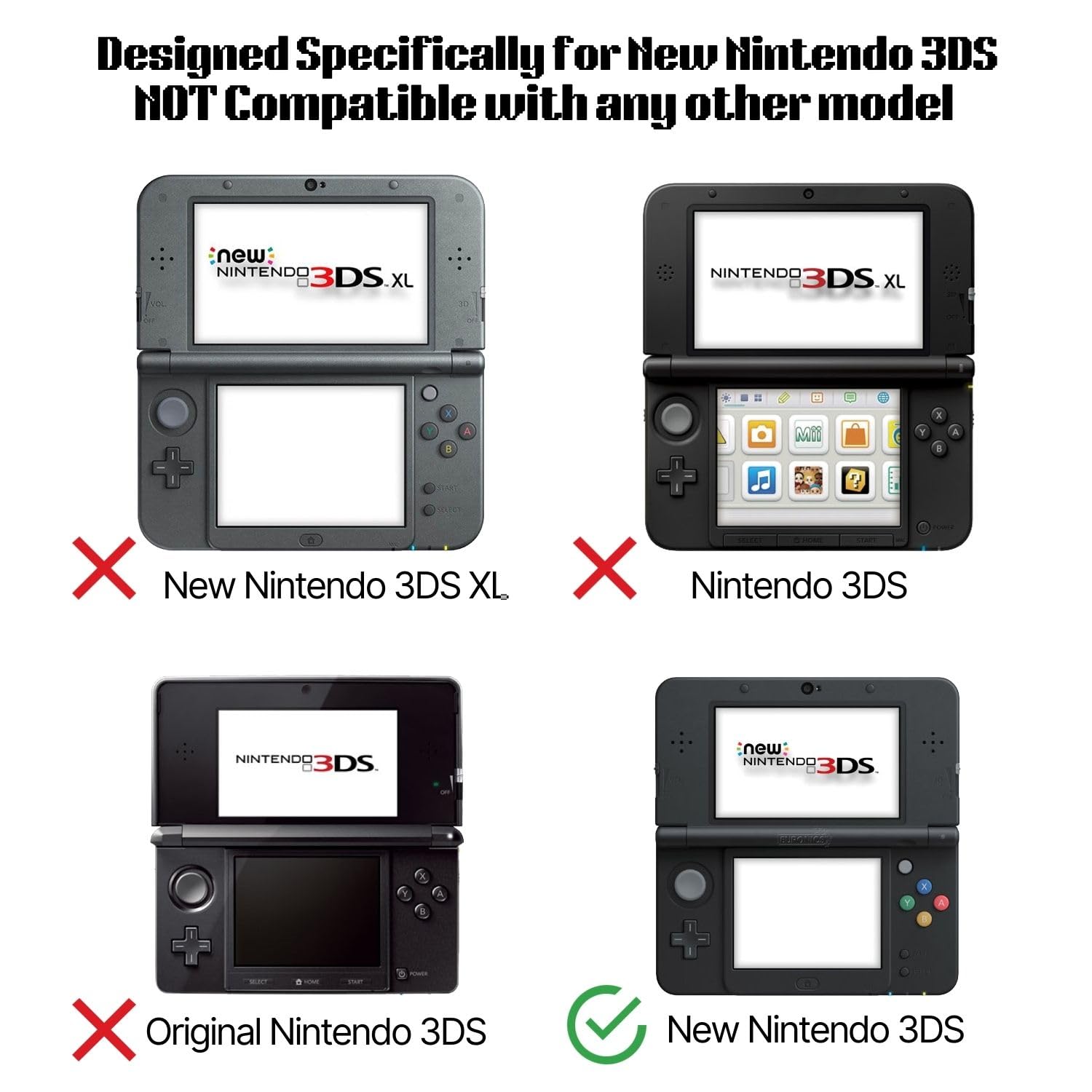 Specially designed for Nintendo New 3DS 2015 Model (non-XL). NOT compatible with new Nintendo 3DS XL, for 3DS XL cases, please visit ASIN: B018DM48BS