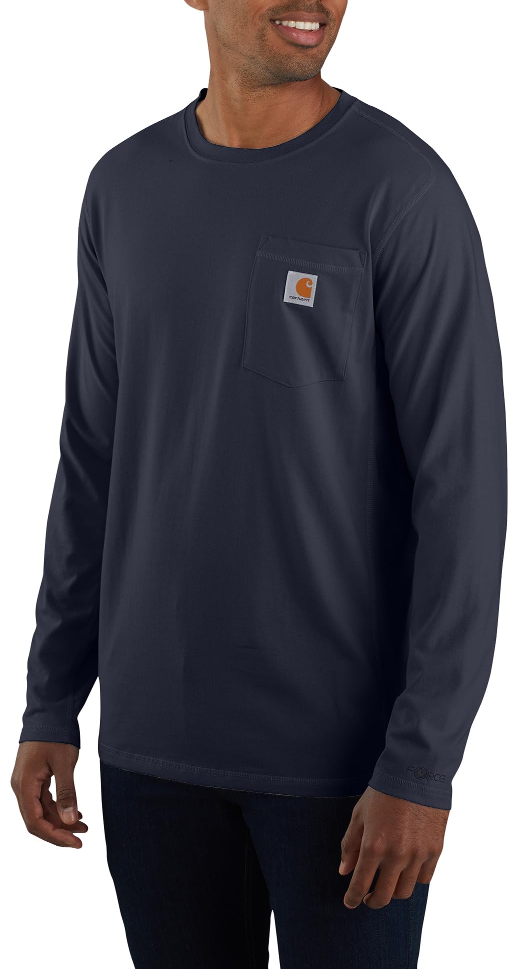 Description Made to withstand warm, sunny days. This men's Carhartt long-sleeve t-shirt helps you keep your cool through long hours under the sun. UPF-rated, cotton-blend fabric fights sweat and dries fast for all-day comfort. Ventilated panels keep air circulating.