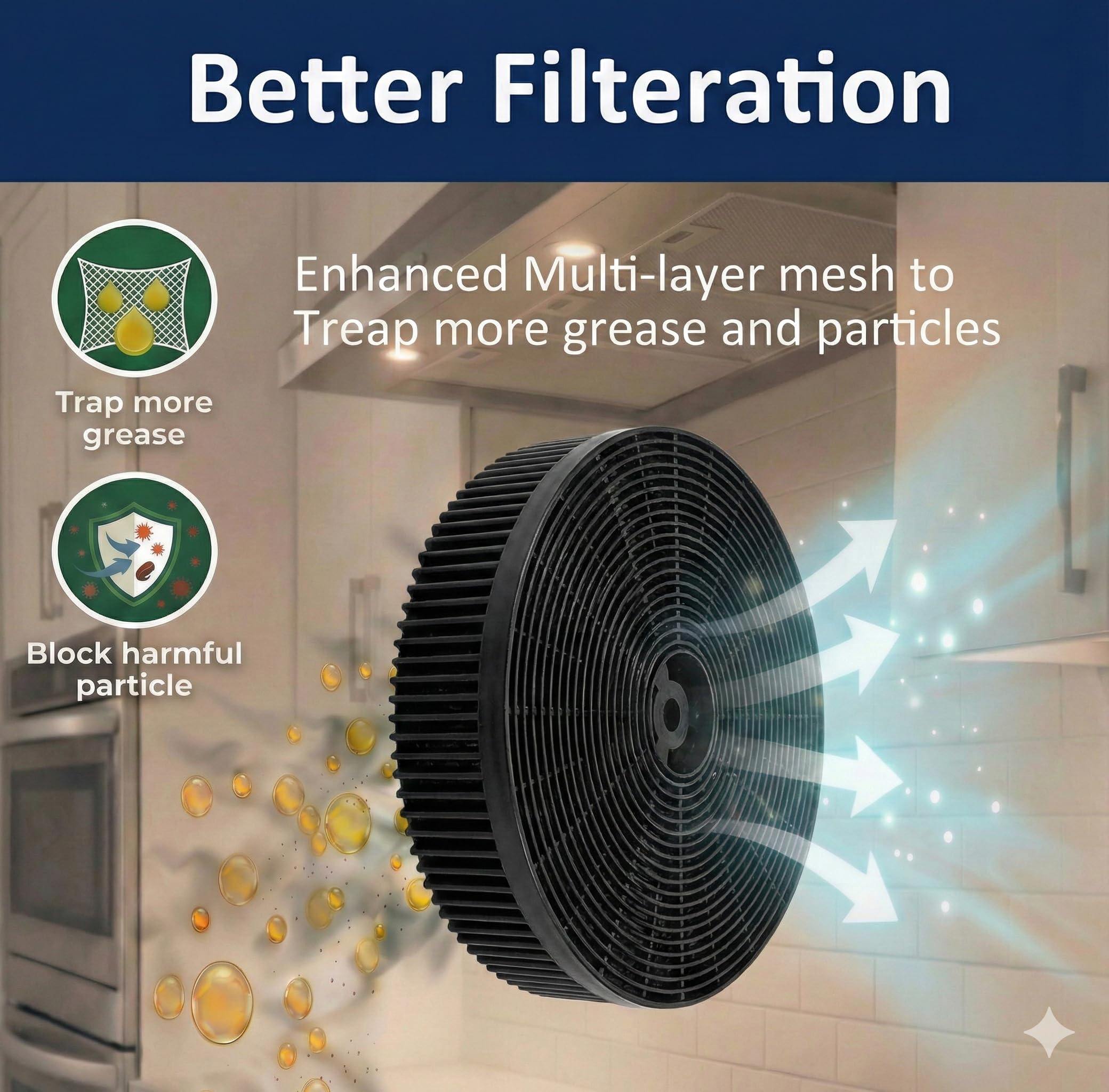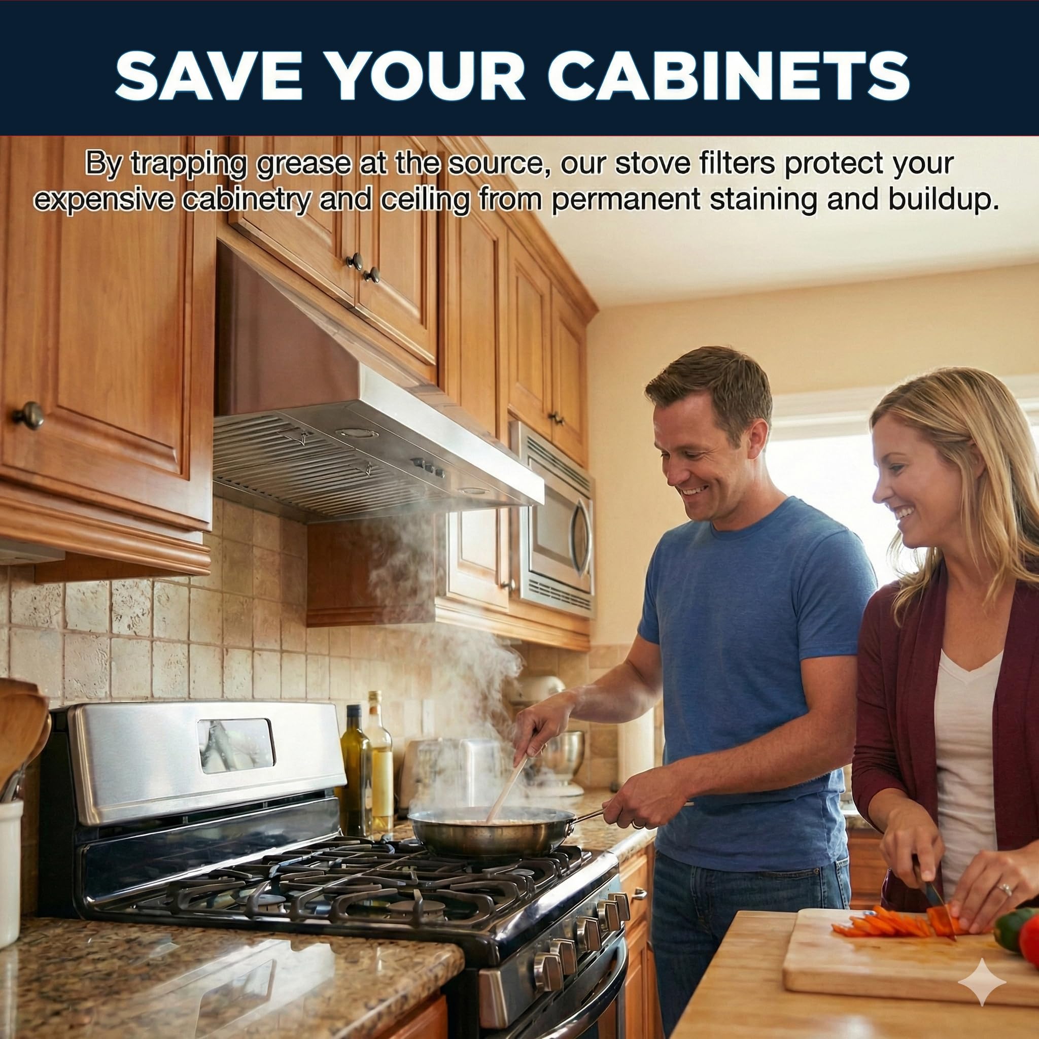 ✅Save Your Cabinets. Stop the "sticky yellow film" before it starts. By trapping grease at the source, our stove vent hood filters protect your expensive cabinetry and ceiling from permanent staining and buildup.