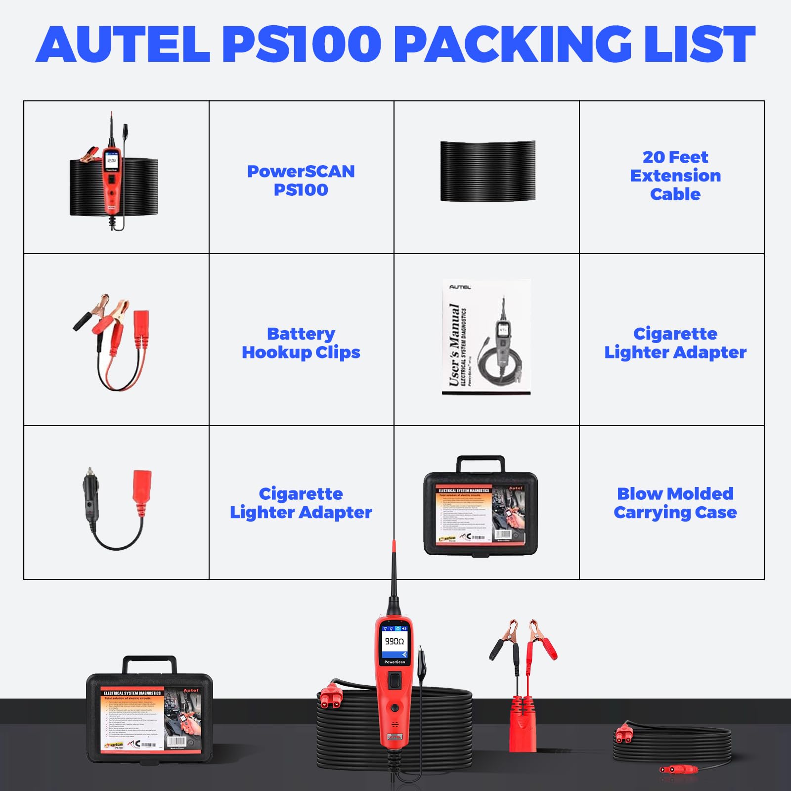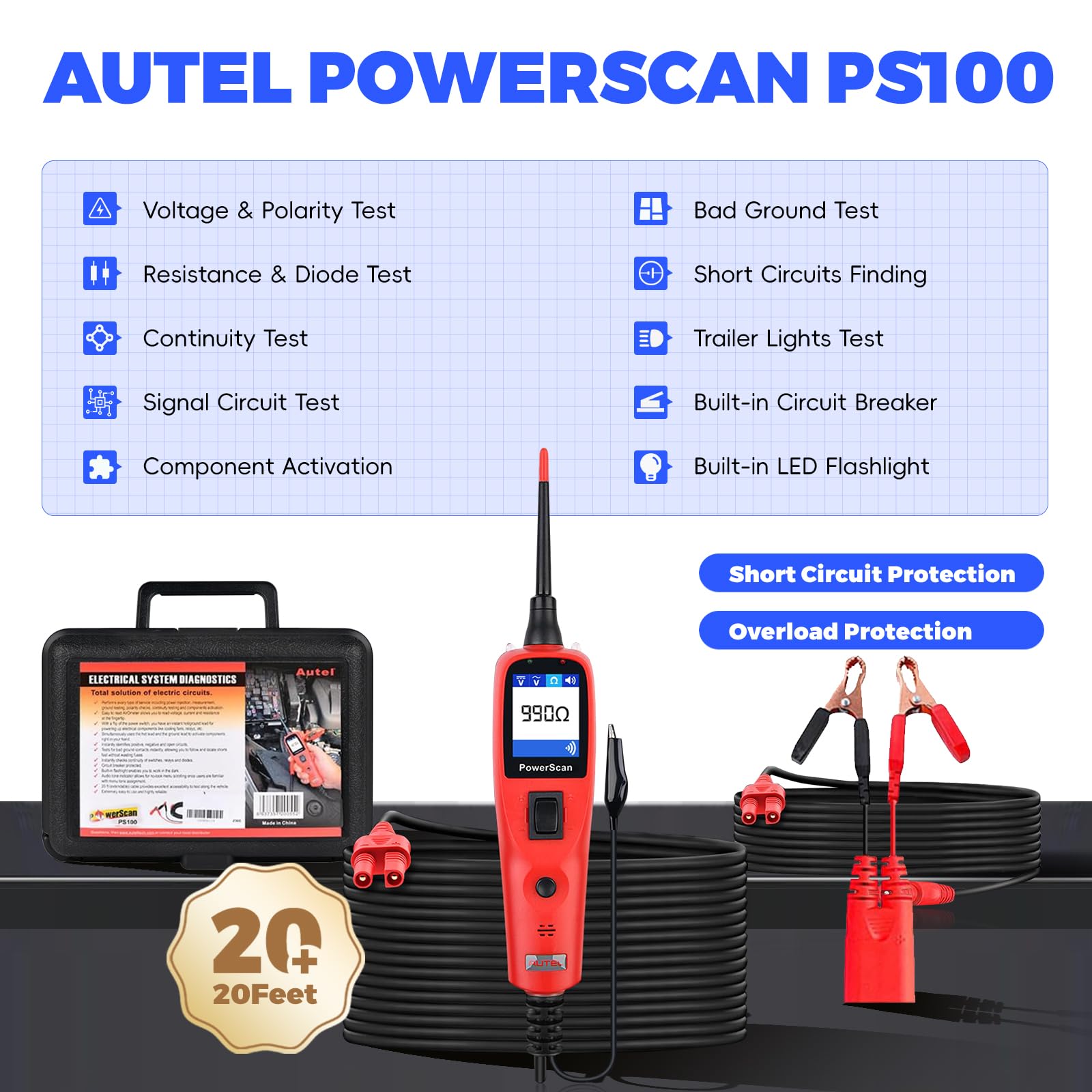 Autel PS100 circuit testing kit comes with built-in flashlight for convenient detection in dark or at night. The extra 20 feet extension cable ensures provides excellent accessibility to test along large vehicles and the entire circuit system of the vehicles can be tested at ease.