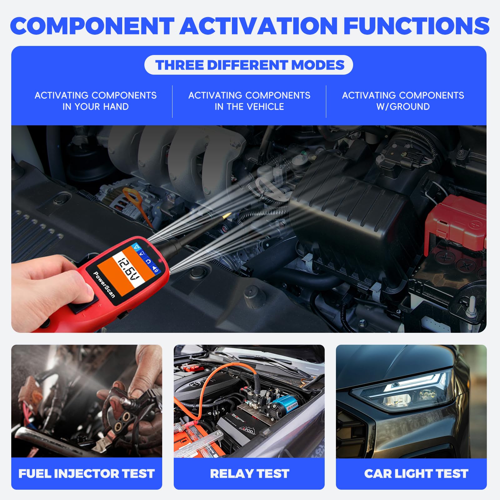 Autel PS100 Power Circuit Probe Kit support component activation in 3 different scenario: in the hand, in the vehicle & with ground. By generating activation signals for the components, you can judge whether the components are in good condition, such as lights, motors, wipers, radiator fans, relays, and fuel injectors, etc. You can also use Autel PS100 circuit checker to find bad ground contact. The response of LED lights can intuitively tell you whether it's true ground.