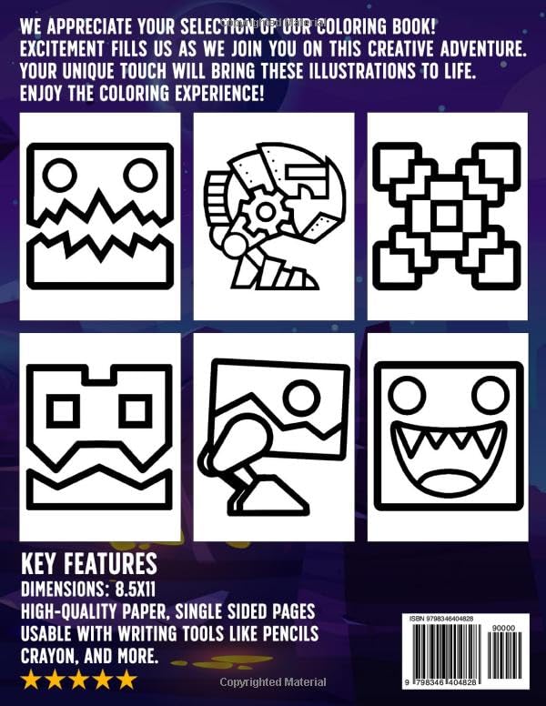 Are you a Geometry Dash fan? If so, this coloring book is for you! The Geometry Dash Coloring Book is filled with Designs and super adorable Geometry Dash characters in different scenes and costumes! 50+ coloring pages with wonderful drawings of various complexity! Fantastic anti-stress designs: The drawings you will find in the book are all different. Every day you can express your creativity by choosing the design that stimulates you the most. High-quality illustrations: The high-quality images in our book allow you to create real works of art. Large format: size page 8.5 x 11’’. Single-sided Pages: Each coloring page is printed on a separate sheet with the back of the page black to minimize the bleed-through problem. Fantastic gift: Surprise your friends or relatives who love to color with this fantastic gift! The multitude of drawings in the book and our attention to detail make it a perfect gift. What are you waiting for? Get the beautiful illustrations of this book now! Do you know someone who loves to color? Surprise them by giving them great pics of this book! Wishing you and your family a lifetime of happiness, optimism, and love. Thank you for choosing our products!
