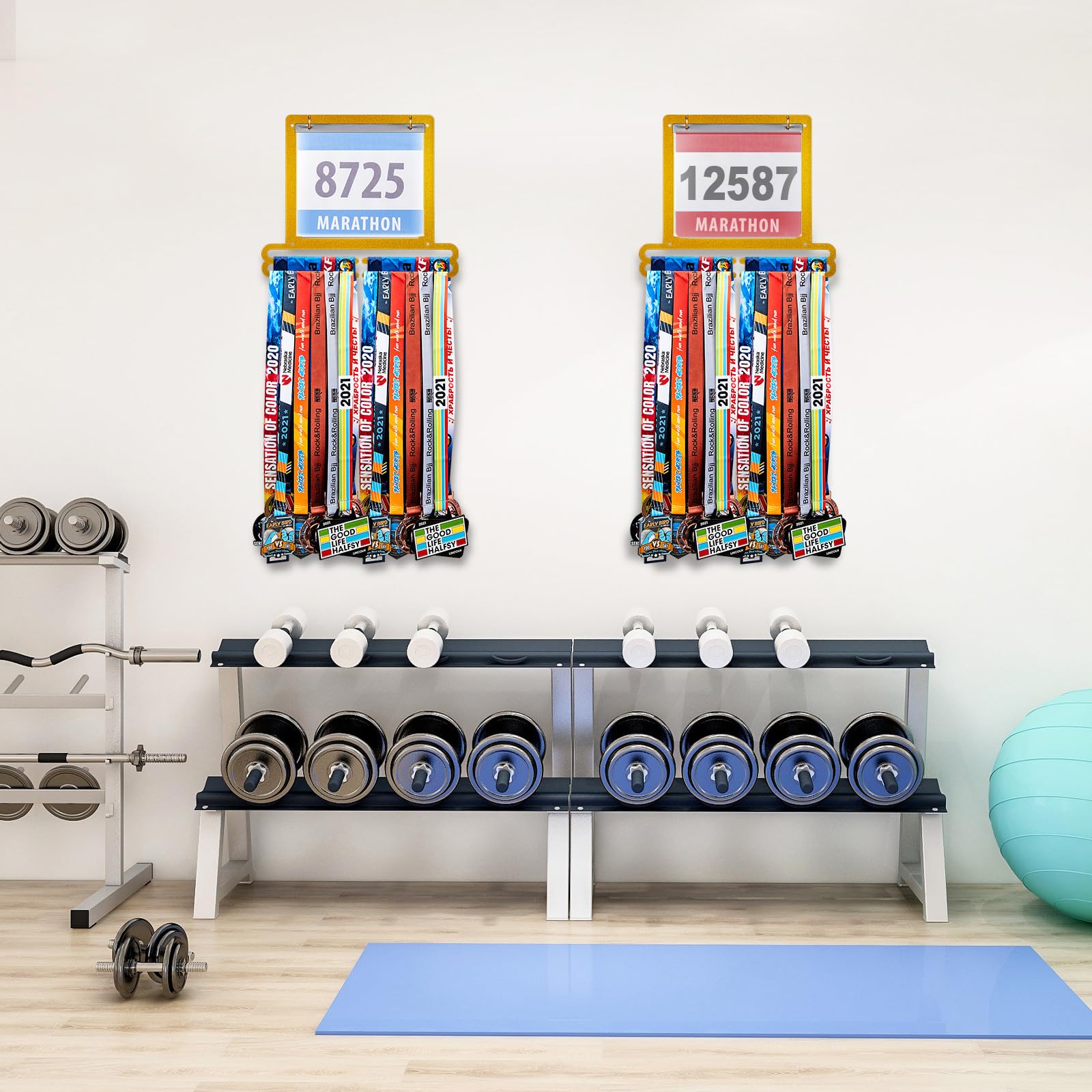 Long lasting to use: made of reliable metal that won't bend or break easily over time, the race bib and medal display is a must-have for most athletes; Multiple hooks hold your race bibs above the hanging medals, and the plastic bib holders are simple to open and close, making it easy for you to use