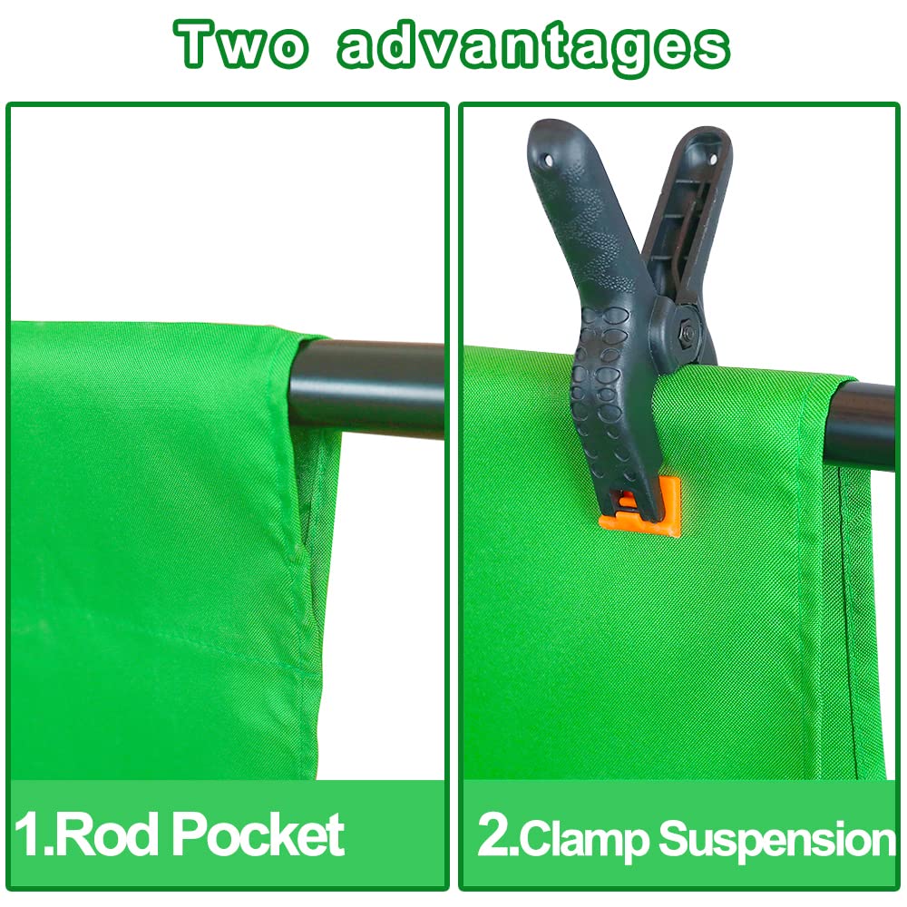 It can be used on both sides, washable, ironable, foldable, durable, light weight, and good vertical feeling, easy to store and carry. And it has a 3.2inch rod pocket in the top to hang backdrop.