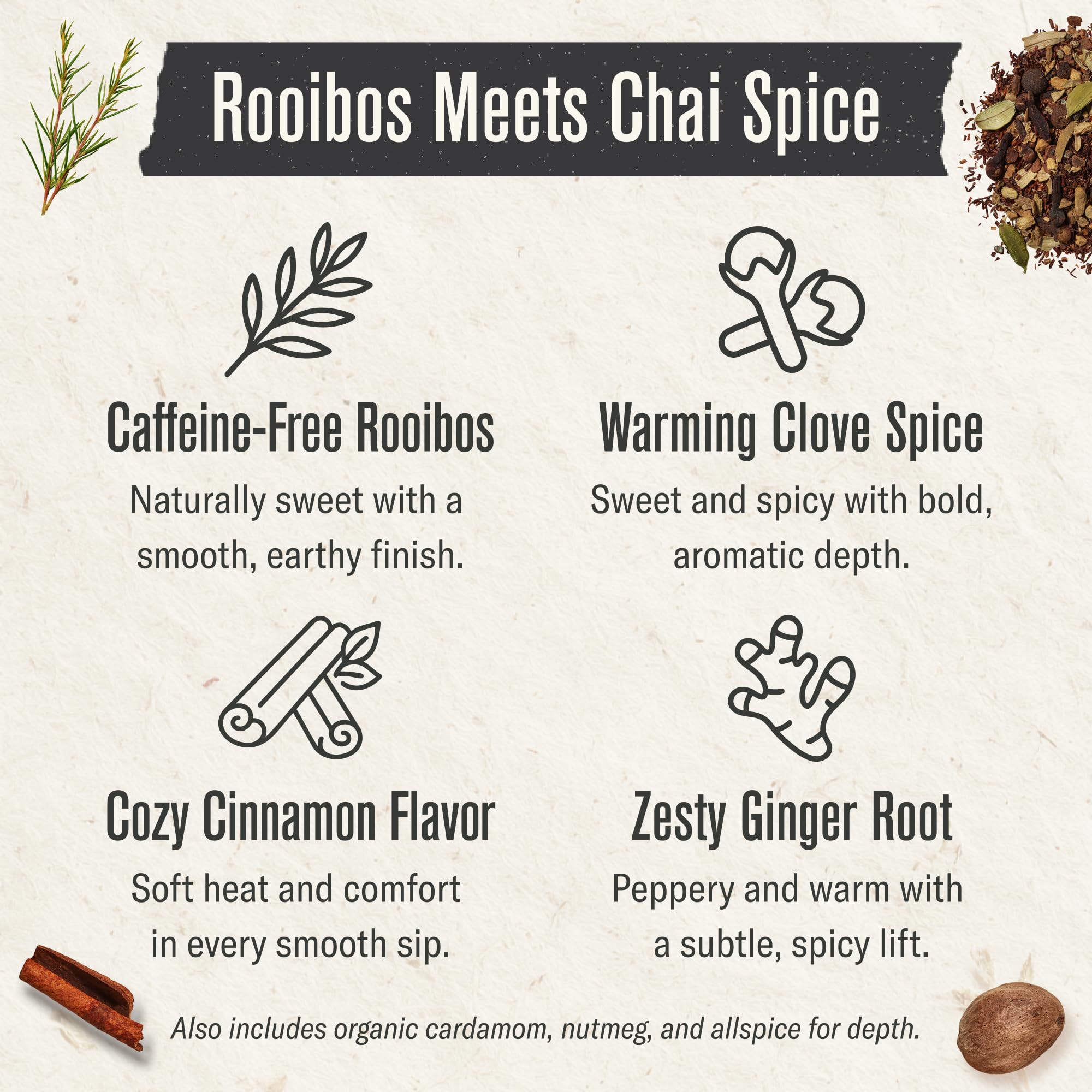 Rich & Spiced Flavor: A warming blend of naturally caffeine-free Rooibos tea infused with aromatic chai spices like cinnamon, cardamom, ginger, and cloves for a soothing and flavorful experience