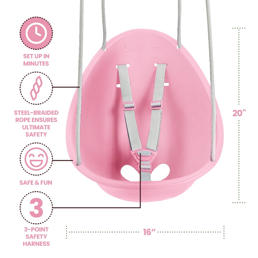3-point safety harness: Swing can be adjusted to your toddler or one year old alike ensuring they are held in the seat at all times. Fabric harness is adjustable and super soft against the skin compared to plastic.