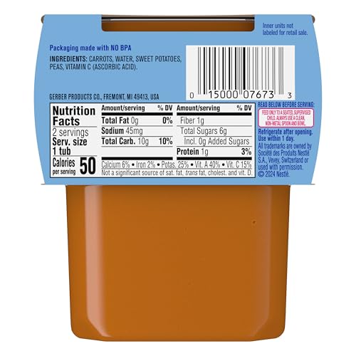 Gerber Stage 2 Baby Food, Carrot Sweet Potato Pea Puree Tubs are a premium choice for your child’s early stages. Crafted to help support their nutritional needs, along with meeting the busy lifestyle needs of caretakers and parents. Each baby puree tub is made in a portable, easy-to-store format – making it perfect for life’s busy moments. This stage 2 baby food puree is designed for babies who are 6 months + and are ready to explore new textures and flavors. Gerber understands the importance of providing wholesome ingredients during the crucial developmental stages of your child's life -- that’s why these tubs are Non-GMO Project Verified. This vegetable baby food puree has no added salt, and no artificial flavors or colors. They need to be refrigerated after opening and must be used after 1 day. Gerber baby puree is ideal for parents who seek a convenient and high-quality option in their baby's diet.