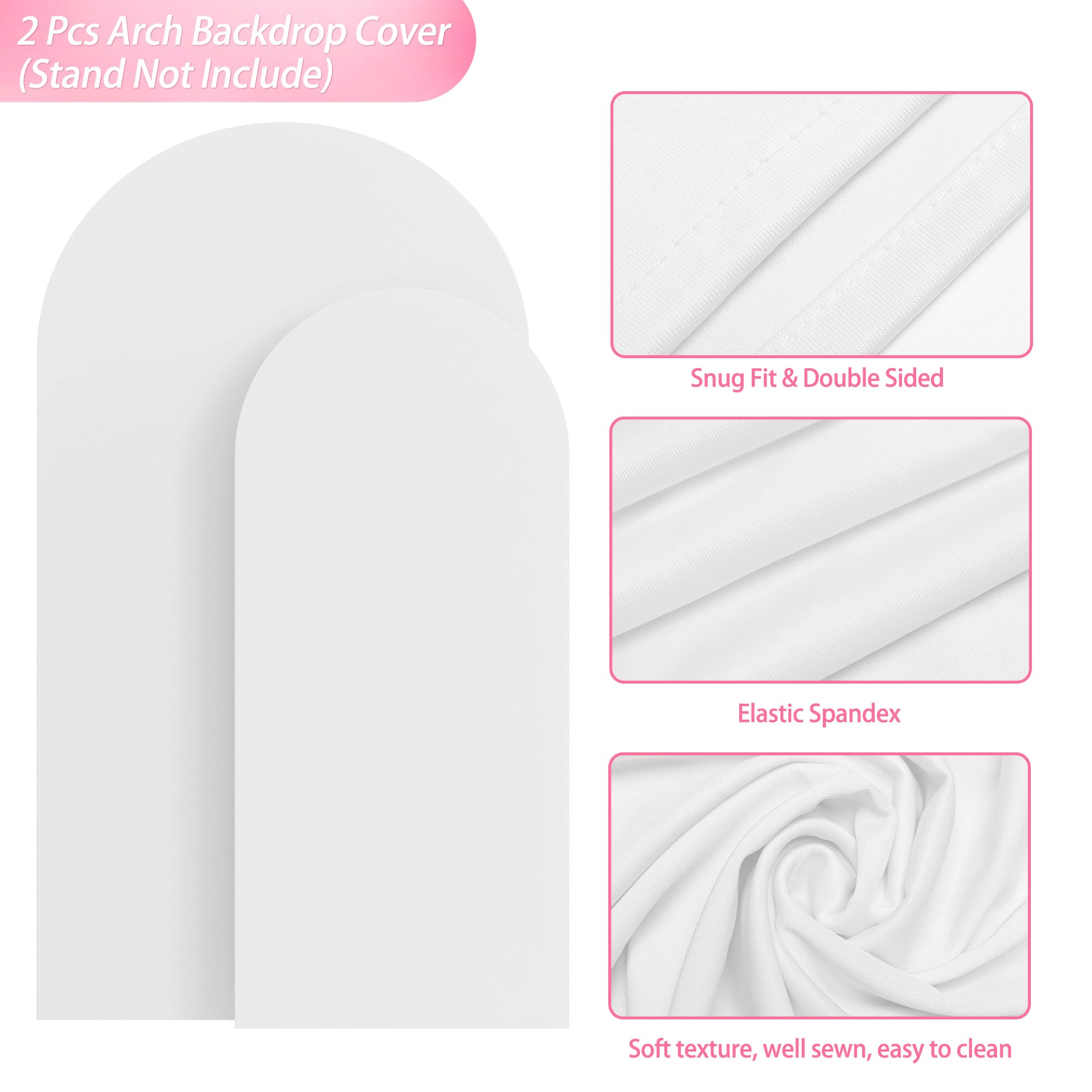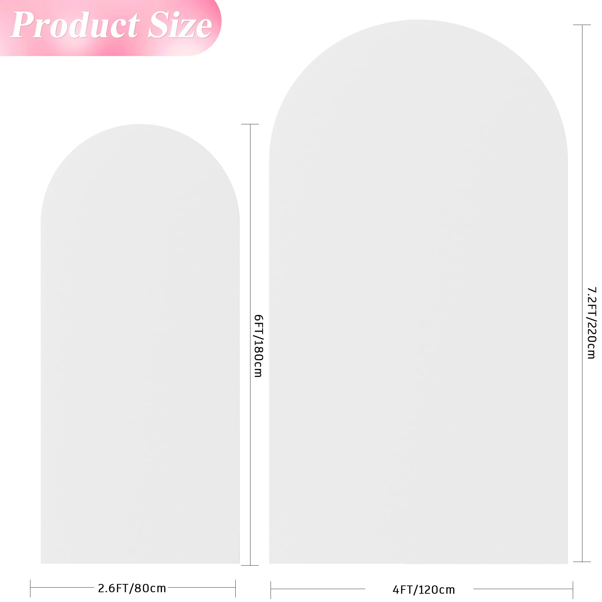 【Arch Covers Package】2 Piece wedding arch cover (Arch stand Not included). Material: Spandex. Color: White. Size: 7.2 x 4ft (HxW) / 6x2.6ft (HxW) . Decorate your party backdrop with our wedding arch covers to create an epic background for your celebration.