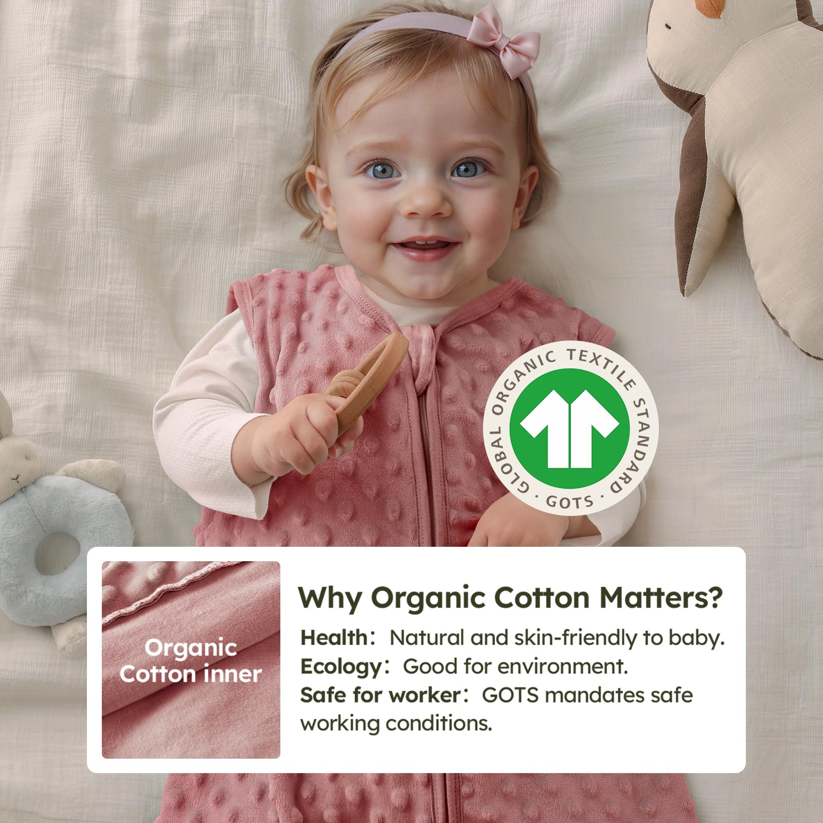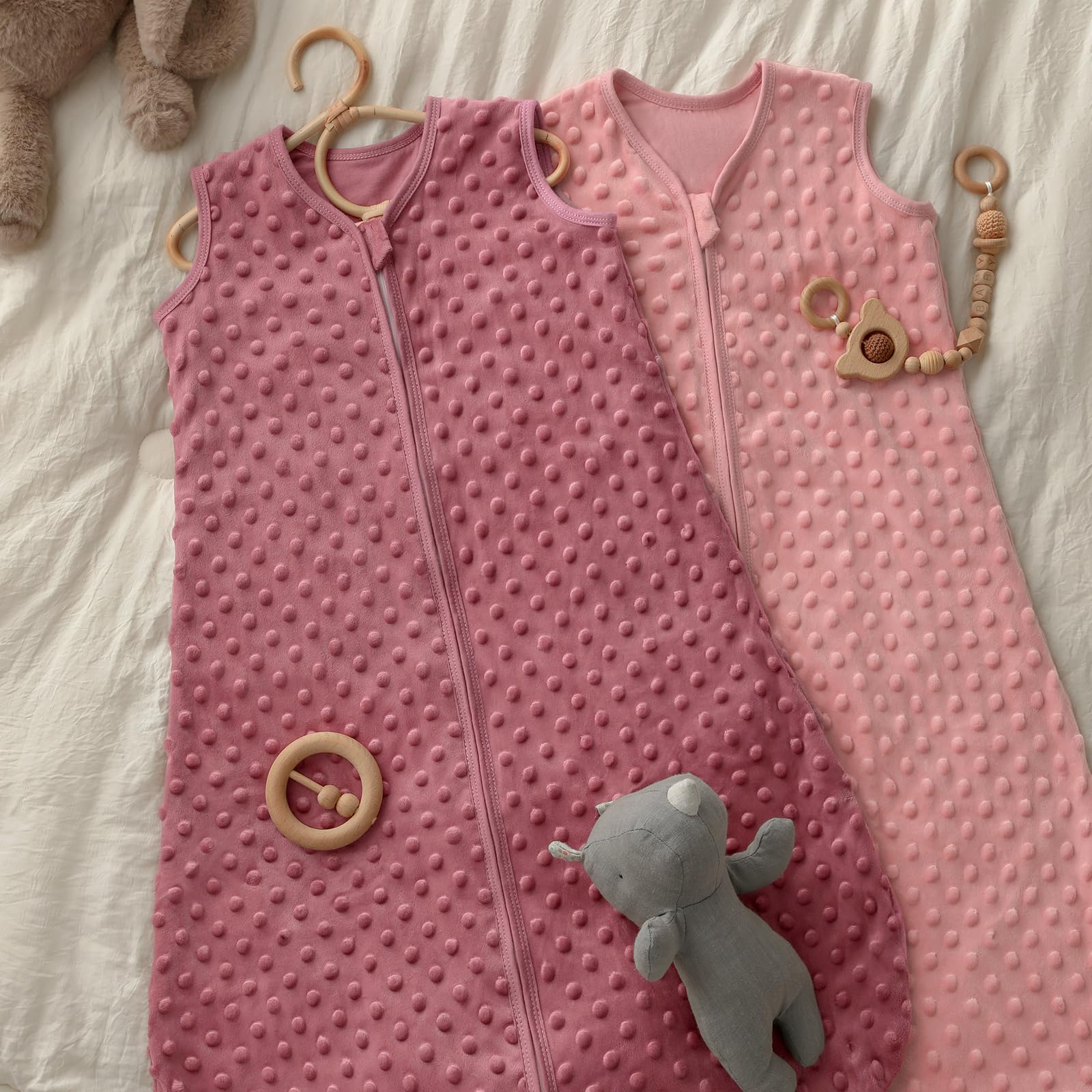 Healthy development - It's plush heart dots surface helps baby fall back to sleep quickly, transform the sleep sacks into an invaluable ally for moms, aiding in lulling their precious ones to sleep while fostering infants'cognitive development. Our baby sleeping sack provides ample room for kicking freely, ensuring your baby stays comfortable throughout the night while promoting healthy hip development.