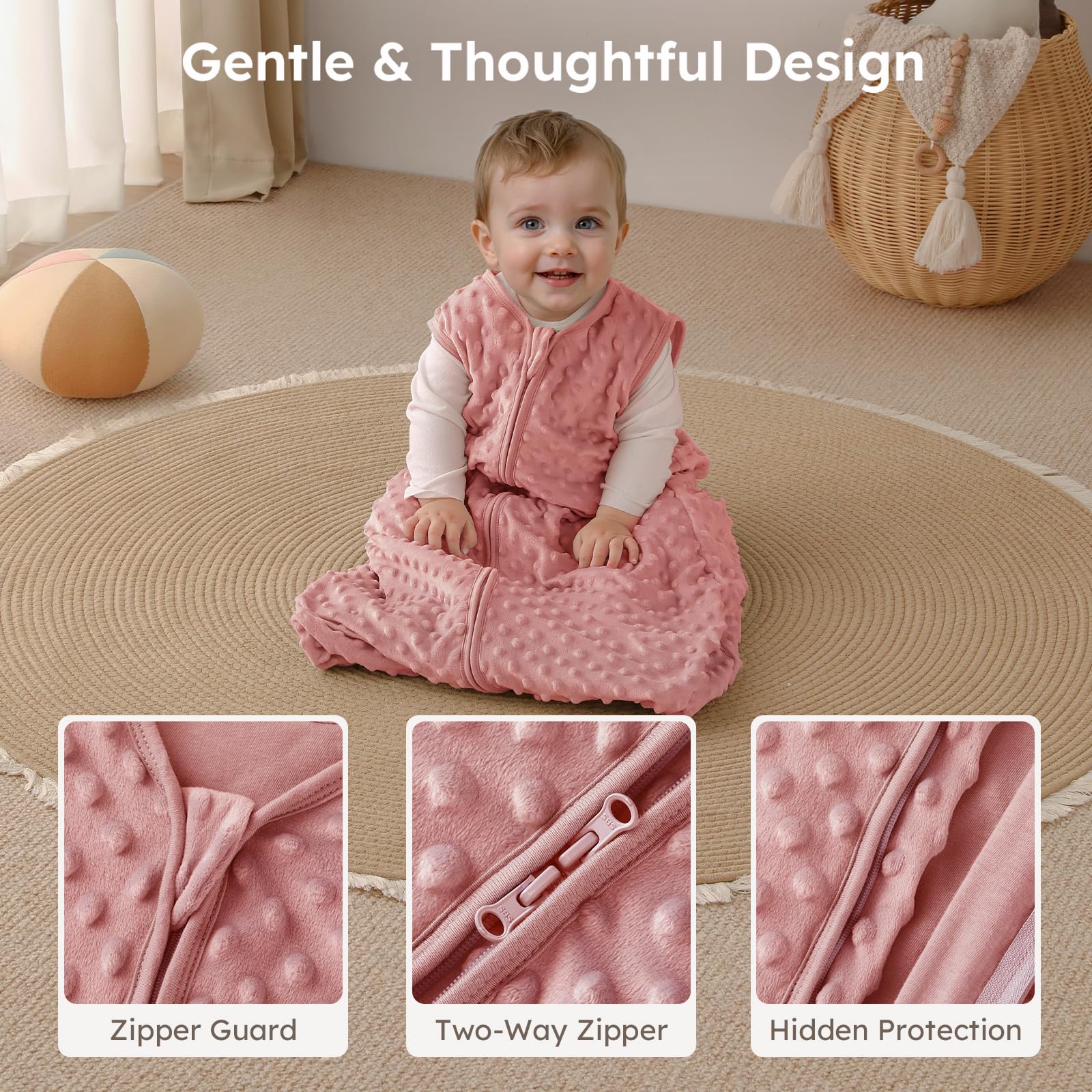 Hidden 2-way Zipper - Hidden zipper and neckline design to avoid any potential scratching baby's delicate skin. Double zipper allows for effortless dressing and making nighttime changes easier. The high-grade zippers of sleep sacks for baby glide smoothly without getting stuck or jammed, easily open and close.