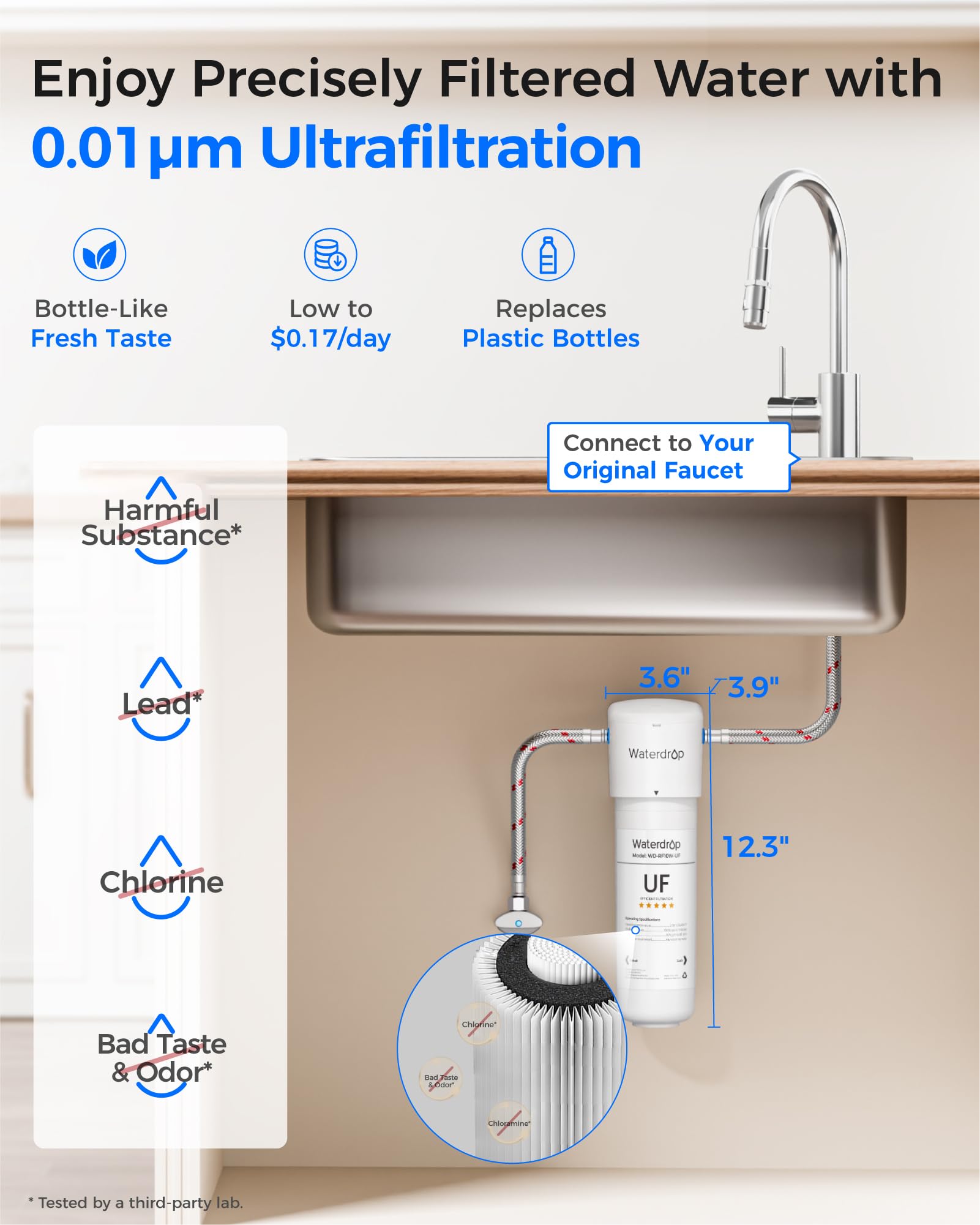 Innovative Multistage Filtration: The Waterdrop Direct Connect Under Sink Water Filter System uses innovative multistage filtration. Tested by third party laboratory against NSF/ANSI 42 standard, the water filter can effectively reduce chlorine, taste and odor. And it can effectively reduces heavy metals, chemical iṁpurity, sediment and other large particles.[1] Tested by third party laboratory against NSF/ANSI 53 standard it can reduce lead. No need to buy bottled water anymore!