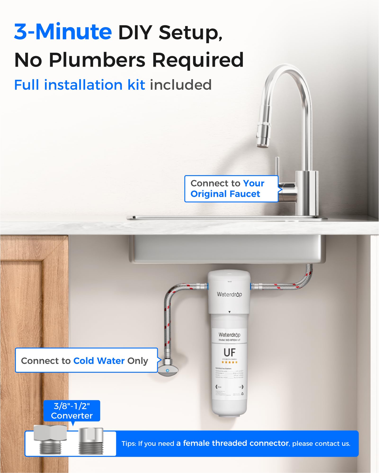 Easy Installation: The system should be connected only to a cold water supply. With innovative push-to-connect fittings, the entire installation process takes less than 3 minutes. The twist-and-lock design ensures that you can replace the filter in 3 seconds. The system includes a 3/8” hose with a direct connection that adapts to standard 3/8’’ feed water valves under US sinks. The 3/8"–1/2" convertor fitting helps you connect the system to both 1/2" and 3/8" cold water lines and faucets.