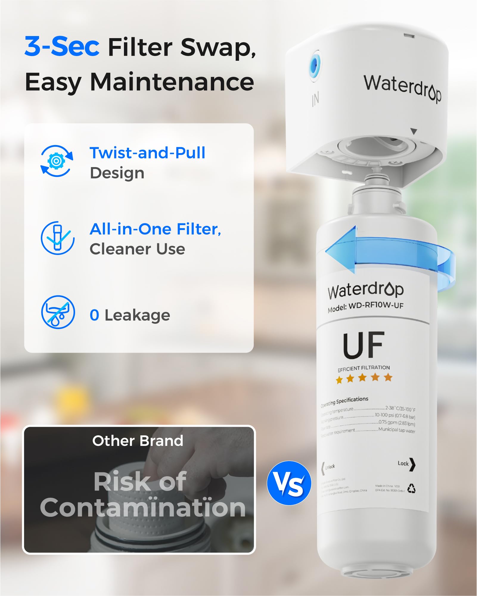Superior Material: 0.01 micron Waterdrop Ultrafiltration Membrane, this under sink water filter reduces chlorine, taste, odor and heavy metals, offering enhanced taste. Activated carbon block and other advanced filter media ensure efficient and safe filtration. Specially selected premium materials are lead-free. The BPA-free, lead-free material ensures more reliable use from the inside out. The activated carbon is made from natural coconut shells. Please confirm whether you are allergic to it.