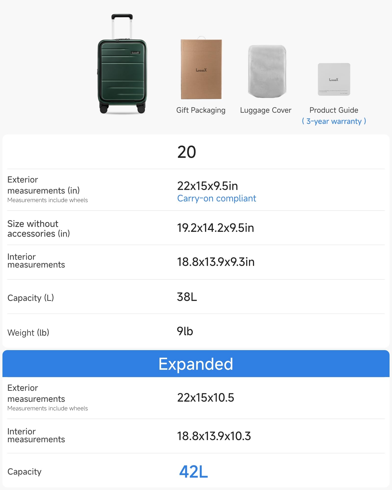 External Dimensions(including wheels and handles): 22x15x9.5 IN(Expanded: 22x15x10.5 IN), Internal Dimensions: 18.8x13.9x9.3 IN(Expanded: 18.8x13.9x10.3 IN), Weight: 9 LB, Total Capacity: 38L(Expanded: 42L)