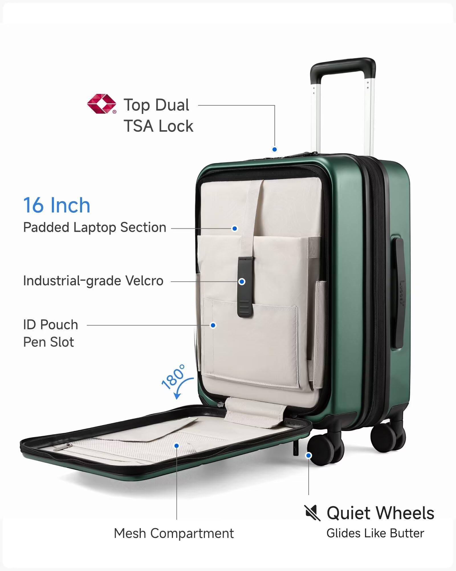 【Redesigned for 16 inch Laptop】Designed for travelers who value efficiency and organization, our 20 inch carry-on features a dedicated front laptop compartment that securely fits devices up to 15x11 inches, keeping them protected and easy to access. The industry-first front-to-rear separation design ensures no overlap between your tech essentials and main packing space, so you can travel with confidence and ease.