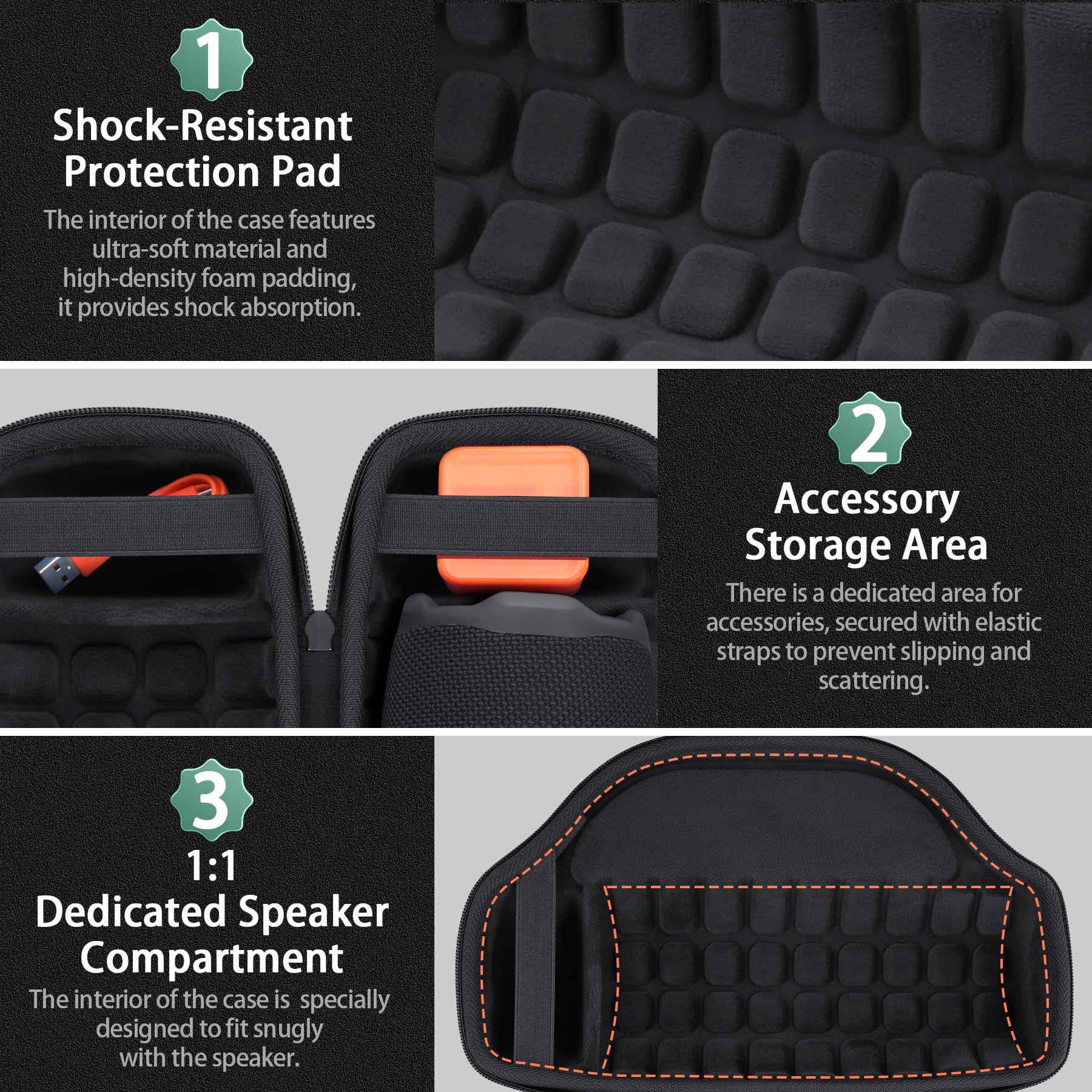 Crafted with precision, this NEW Charge 6 portable wireless speaker protective case is designed to snugly encase the Charge 6 portable waterproof outdoor speaker. The bocinas Charge 6 waterproof speaker portable speaker case has two accessories storage areas to accommodate the Charge 6 usb-c quick charger and Charge 6 speaker charging cable more accessories. This elastic strap that securely hold the speaker accessories in place, preventing movement or collision during transport.