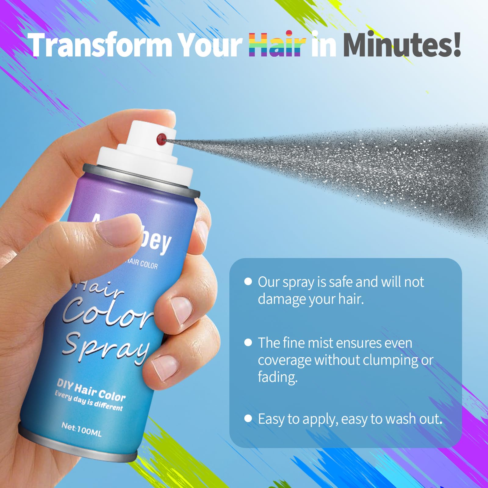Easy Spray-On: Achieve salon-worthy color effortlessly. Simply shake and spray this hair spray directly onto styled hair—no gloves, brushes, or drips. Get even, vibrant coverage in under a minute, perfect for DIY looks.