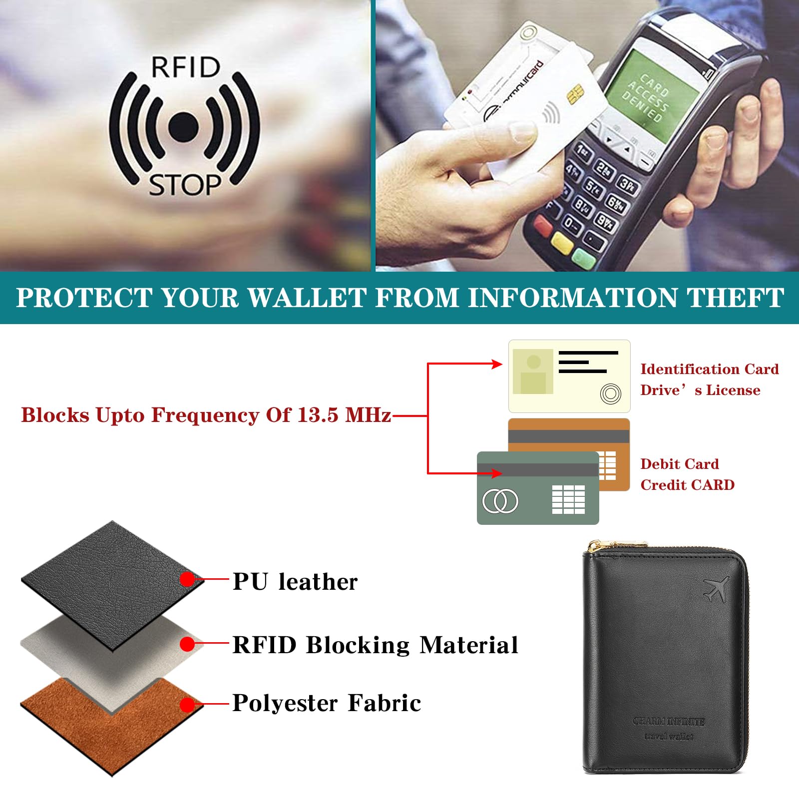 RFID Security: The leather passport holder rfid blocking has a special material to block RFID signals so that the passport organizer can protect your personal information in your passport and credit cards from unauthorized scans. RFID blocking shielding material of the passport holder men women is used to prevent thieves from swiping your credit card to steal your personal information in airports or crowded places