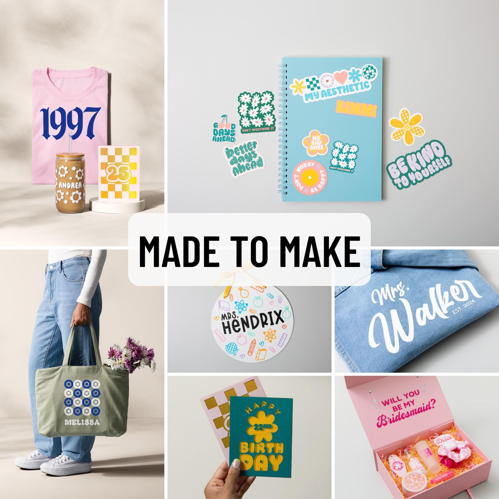 Most Loved Materials: This kit includes favorite materials including both Heat Transfer Vinyl and Adhesive Vinyl. Cricut materials are thoughtfully engineered and rigorously tested to work flawlessly with your Cricut cutting machine. They are easy to cut, weed and transfer, allowing you to bring your creative ideas to life with ease! Heat-transfer materials are made to outlast 50 washes! These materials are perfect for creating custom t-shirts, tote bags, party decorations, cup decals and more.
